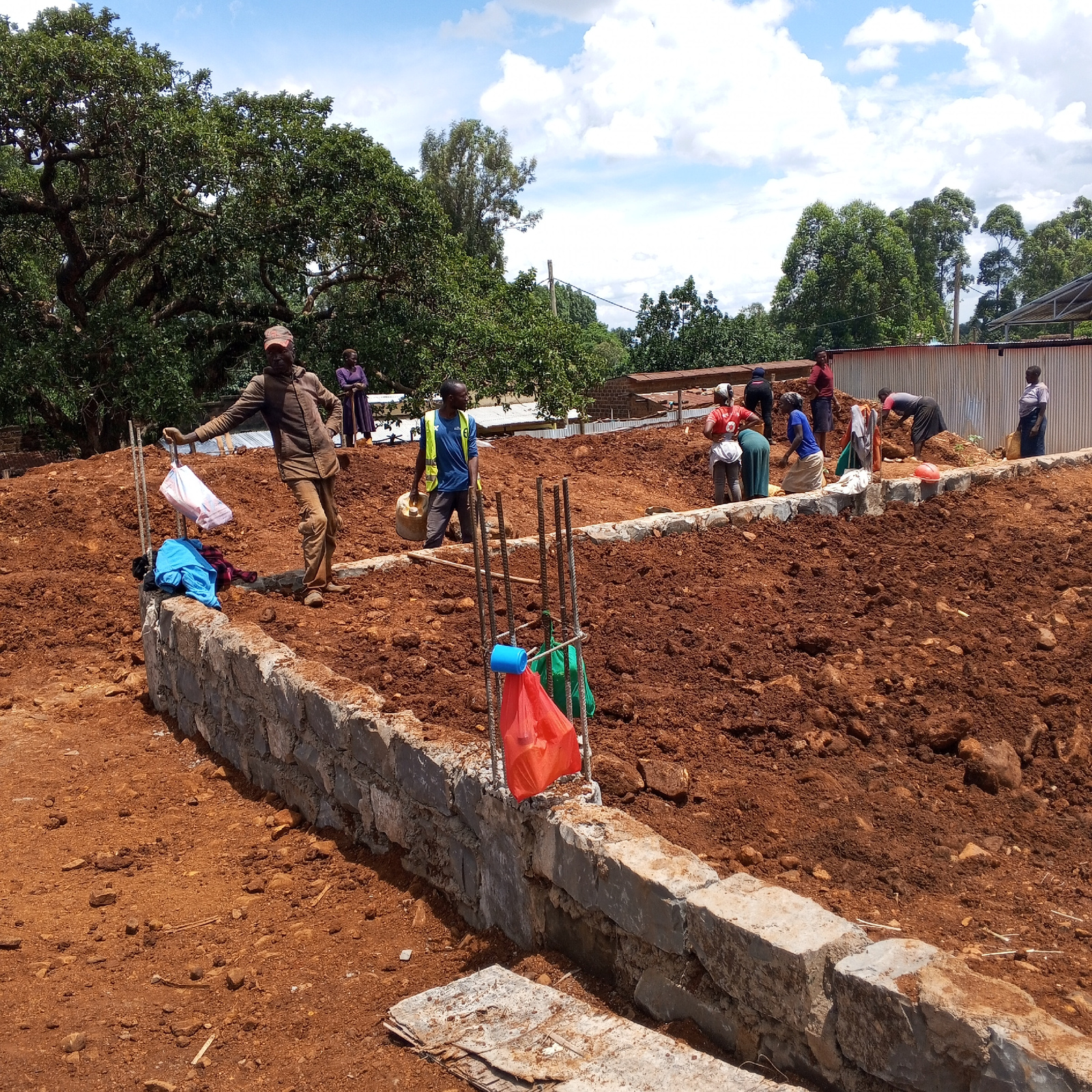 The image depicts an active outdoor construction or land preparation site in Borabu Chitago ward, Kenya, under a bright, partly cloudy sky. The scene is dominated by reddish-brown soil and several ind…read more