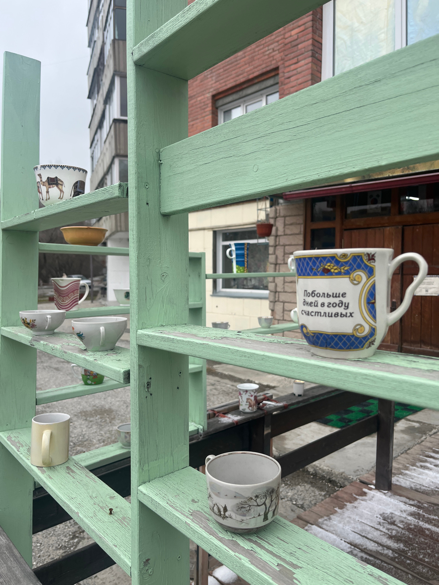 This image, taken from a low angle, depicts a wooden trellis painted a light green color, decorated with various porcelain teacups. The teacups are attached to the trellis, creating a decorative displ…read more