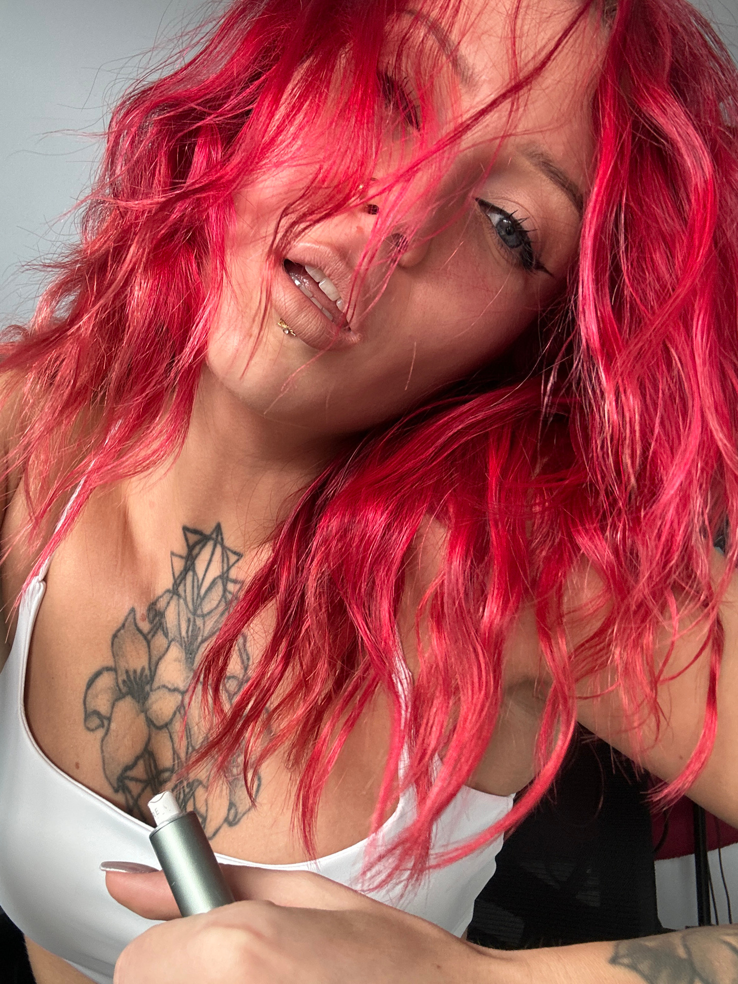A fair-skinned woman with bright red wavy hair is positioned at an unusual angle, suggesting the photograph was taken from a top-down perspective. Her left eye is visible, framed by dark eyeliner. She…read more