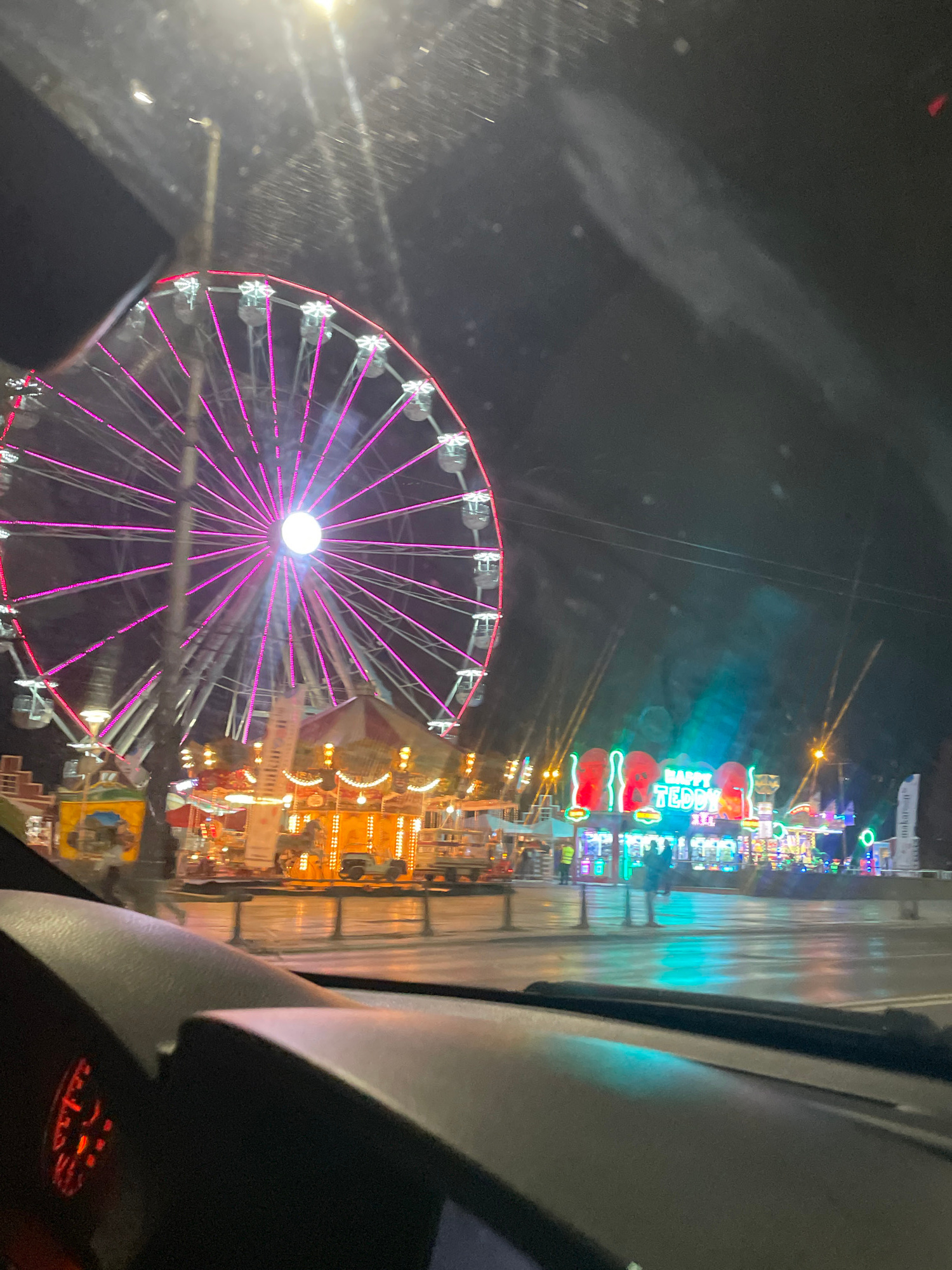 The image shows a night scene taken from inside a vehicle, possibly a car. The primary focus is a large Ferris wheel illuminated with pink lights. In the background, there's a fair or carnival scene w…read more