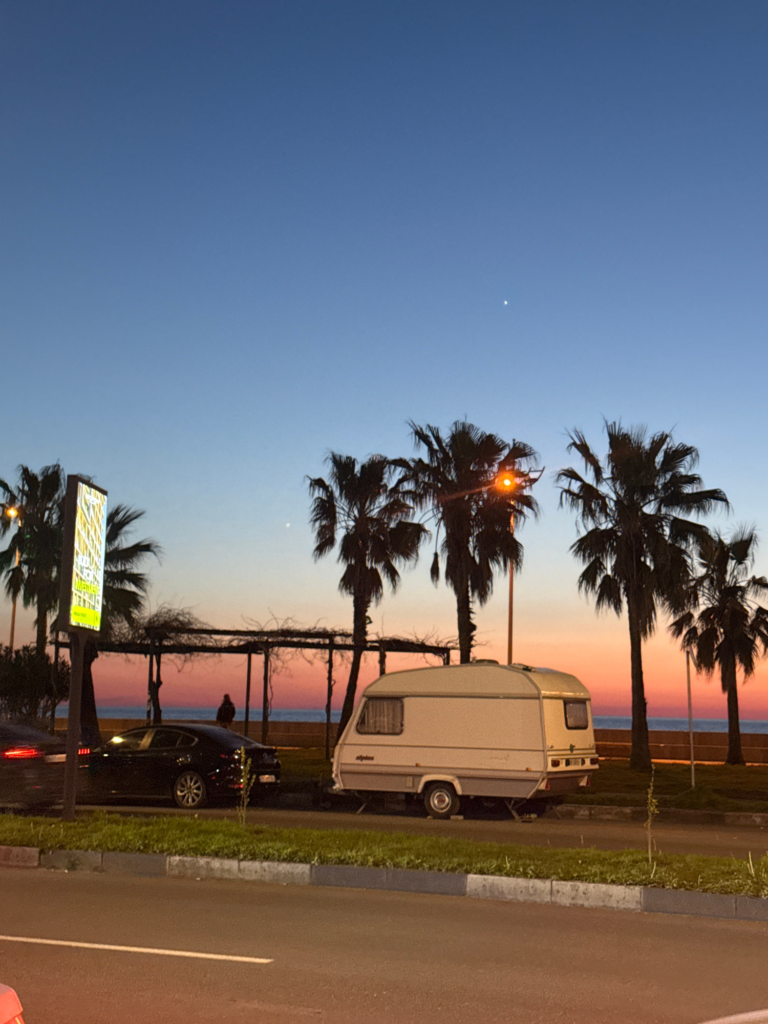The photograph shows a street scene at dusk in Batumi, Georgia. The sky transitions from deep blue to a pink and orange horizon over the Black Sea. Along the roadside, there are palm trees and a grassβ¦read more