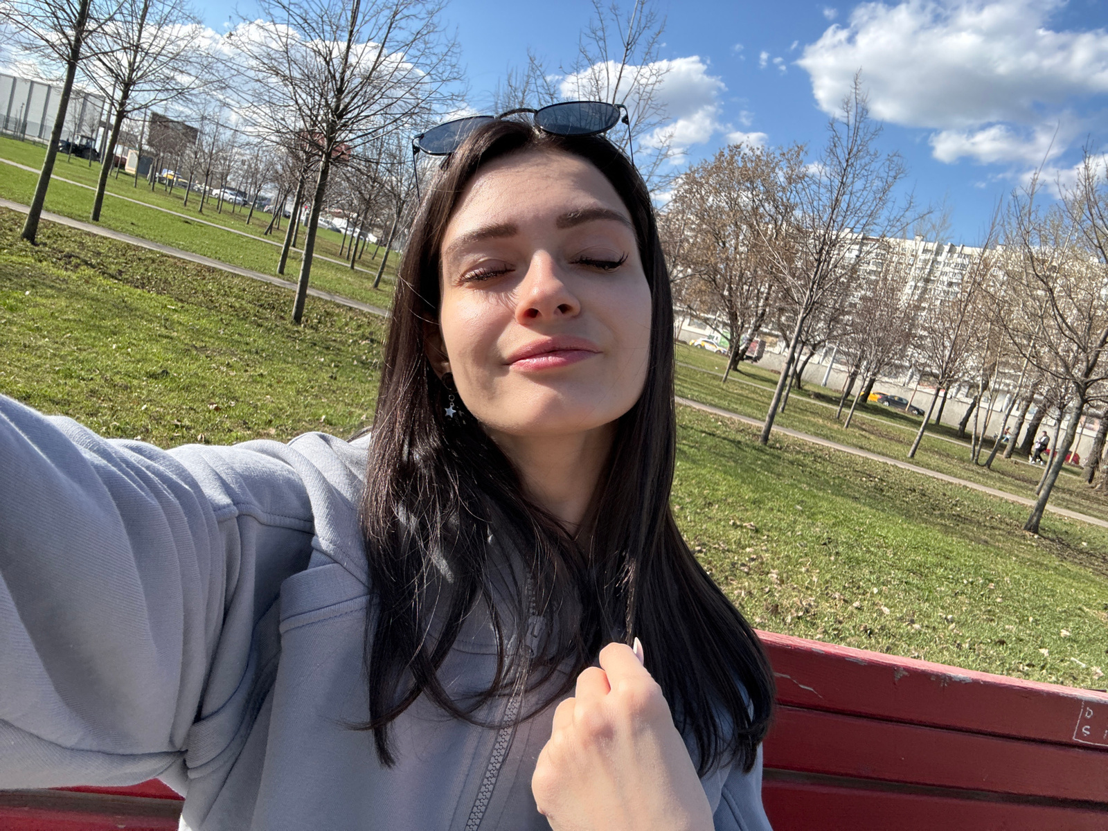 A young woman with dark hair is lying on a red bench, possibly a park bench. She's wearing a light gray hooded sweatshirt. Her sunglasses rest just below her closed eyes. The background reveals a park…read more