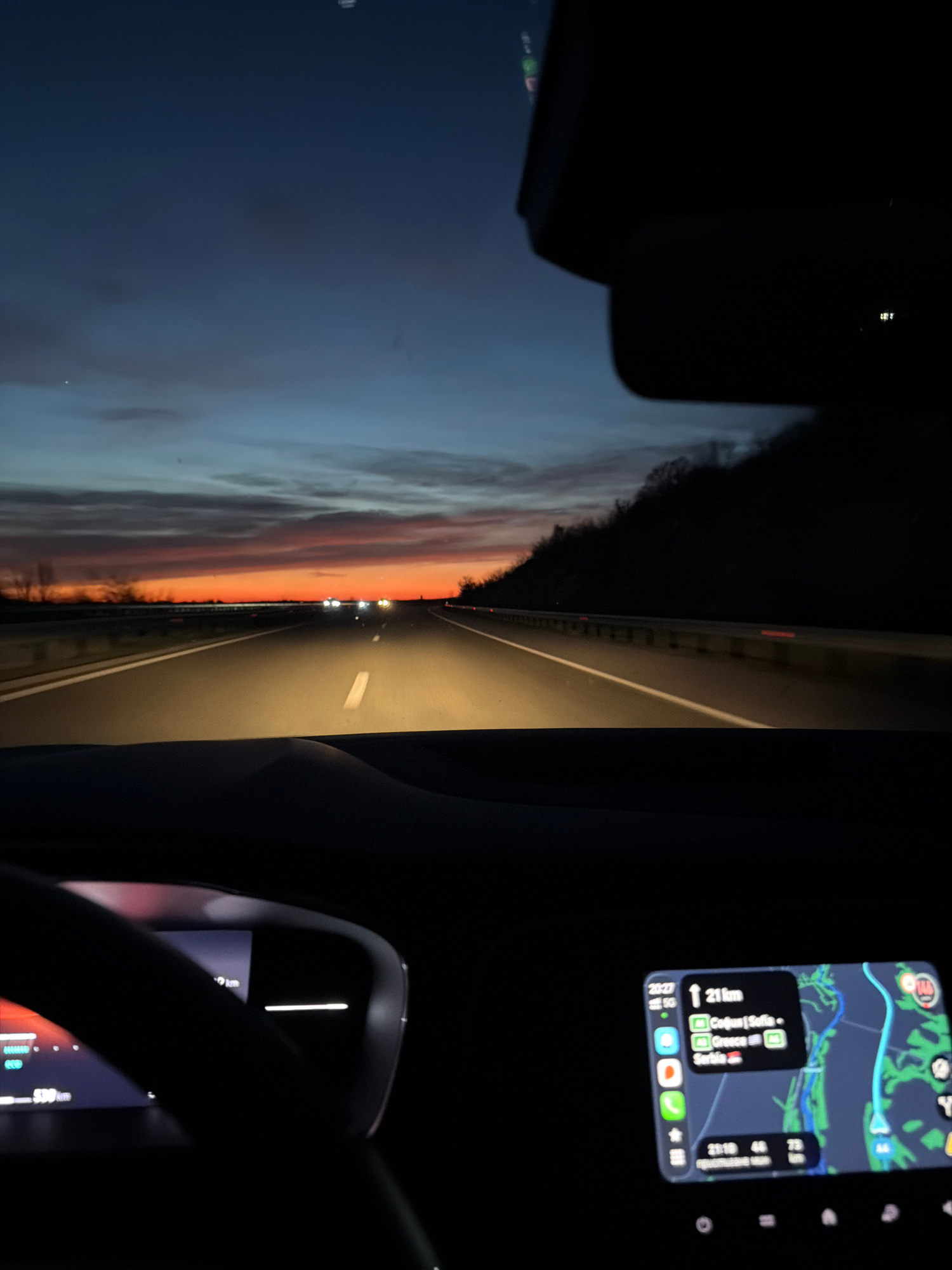 The image shows a view from inside a vehicle traveling on a highway at dusk or dawn. The sky displays a gradient of colors from blue to orange near the horizon. The road ahead is illuminated by the ve…read more