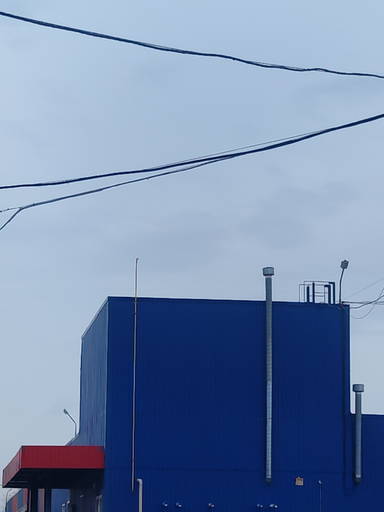 The image shows the exterior of a large, modern building located in Chaikovsky, Russia. The building has a boxy, industrial design, with blue metal paneling dominating the facade. A red overhang is vi…read more