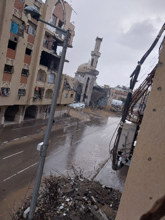 This image displays a scene of significant urban destruction in Khan Yunis, Palestinian Territory, under an overcast sky. A severely damaged multi-story beige building occupies the left side, featurin…read more