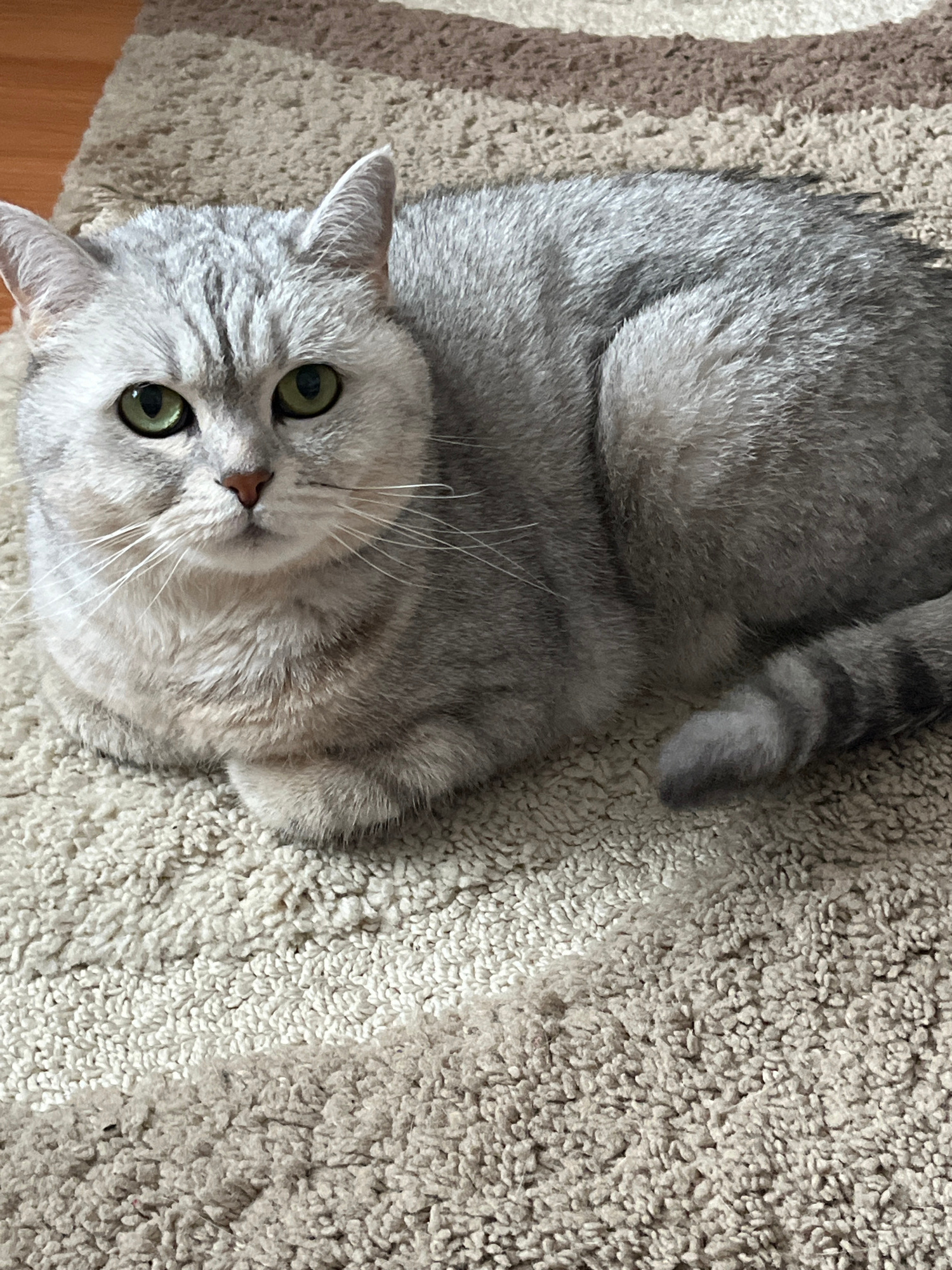 A silver tabby cat with green eyes lies on a beige carpet with a striped pattern. The cat is curled up, facing the camera. Part of a wooden floor is visible in the lower left corner of the image. The…read more