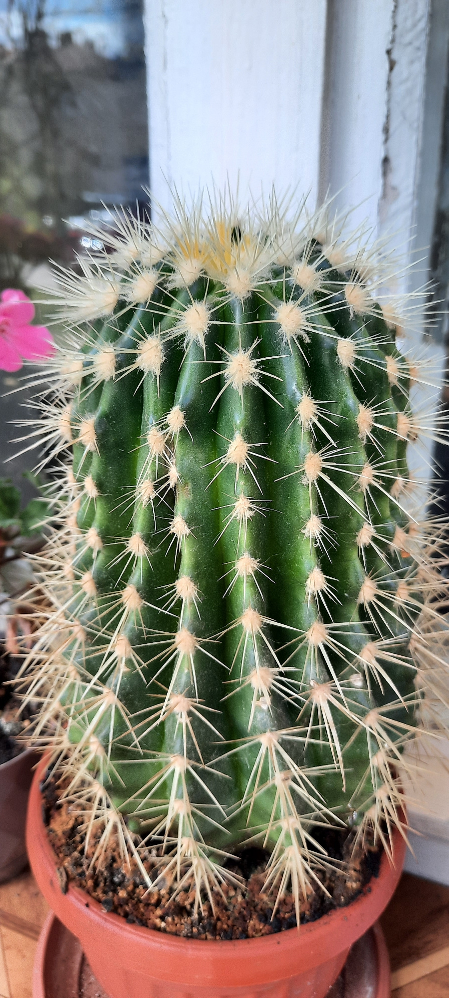 The image shows a potted golden barrel cactus. The cactus is round and green with prominent vertical ridges and numerous sharp, yellow spines. It is planted in a brown plastic pot filled with soil. Thβ¦read more