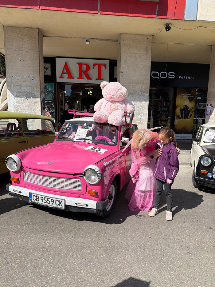 The scene depicts a street in Veliko Tarnovo, Bulgaria, under bright daylight. A vibrant pink Trabant 601 automobile, with Bulgarian license plate "CB 9559 CK" and race number "85" on its hood, is par…read more