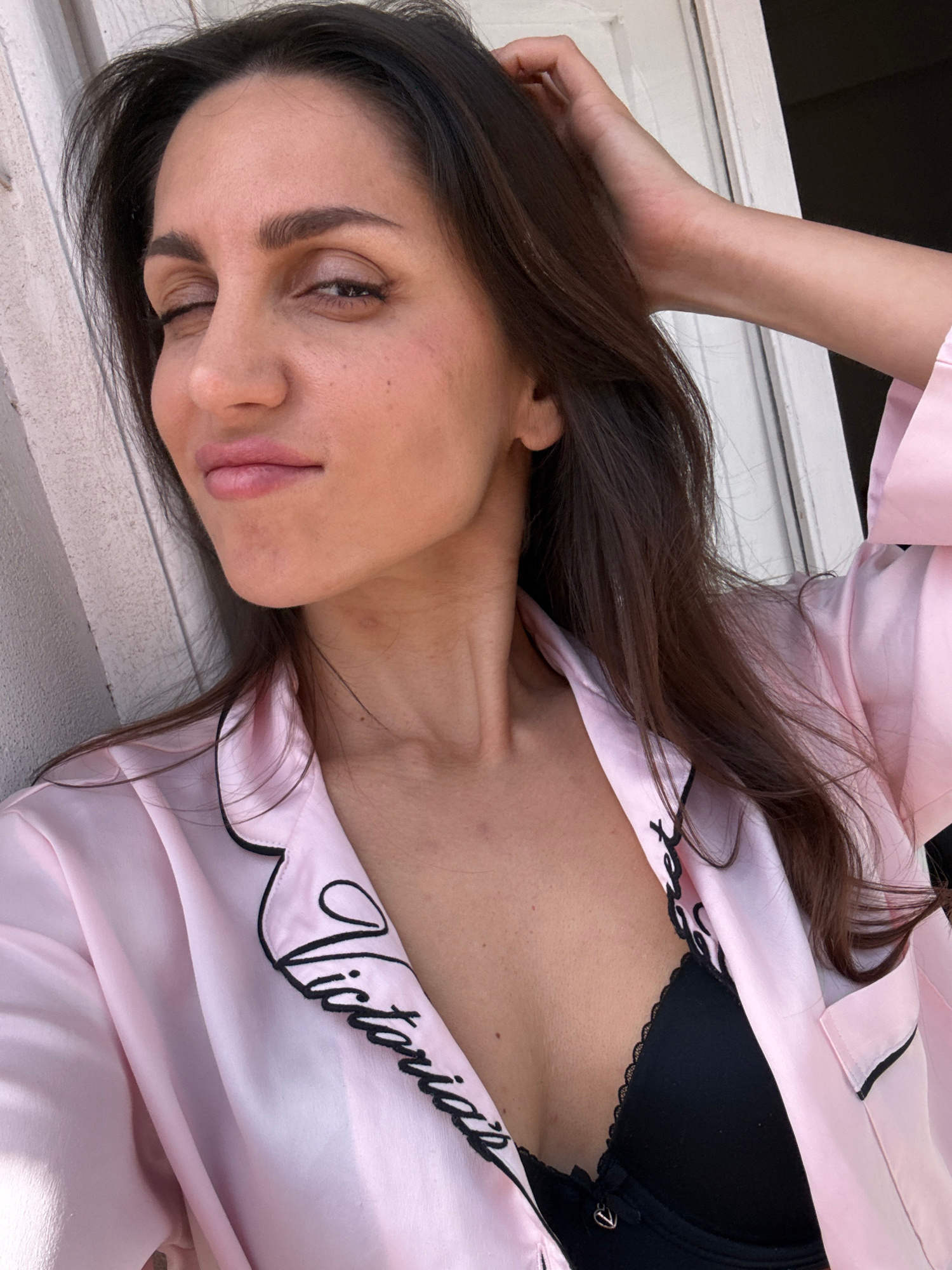 A woman with long brown hair, wearing a pink Victoria's Secret robe and a black bra, is lying on a white painted wooden surface. Her head is tilted to the side, and her eyes are partially closed. She…read more