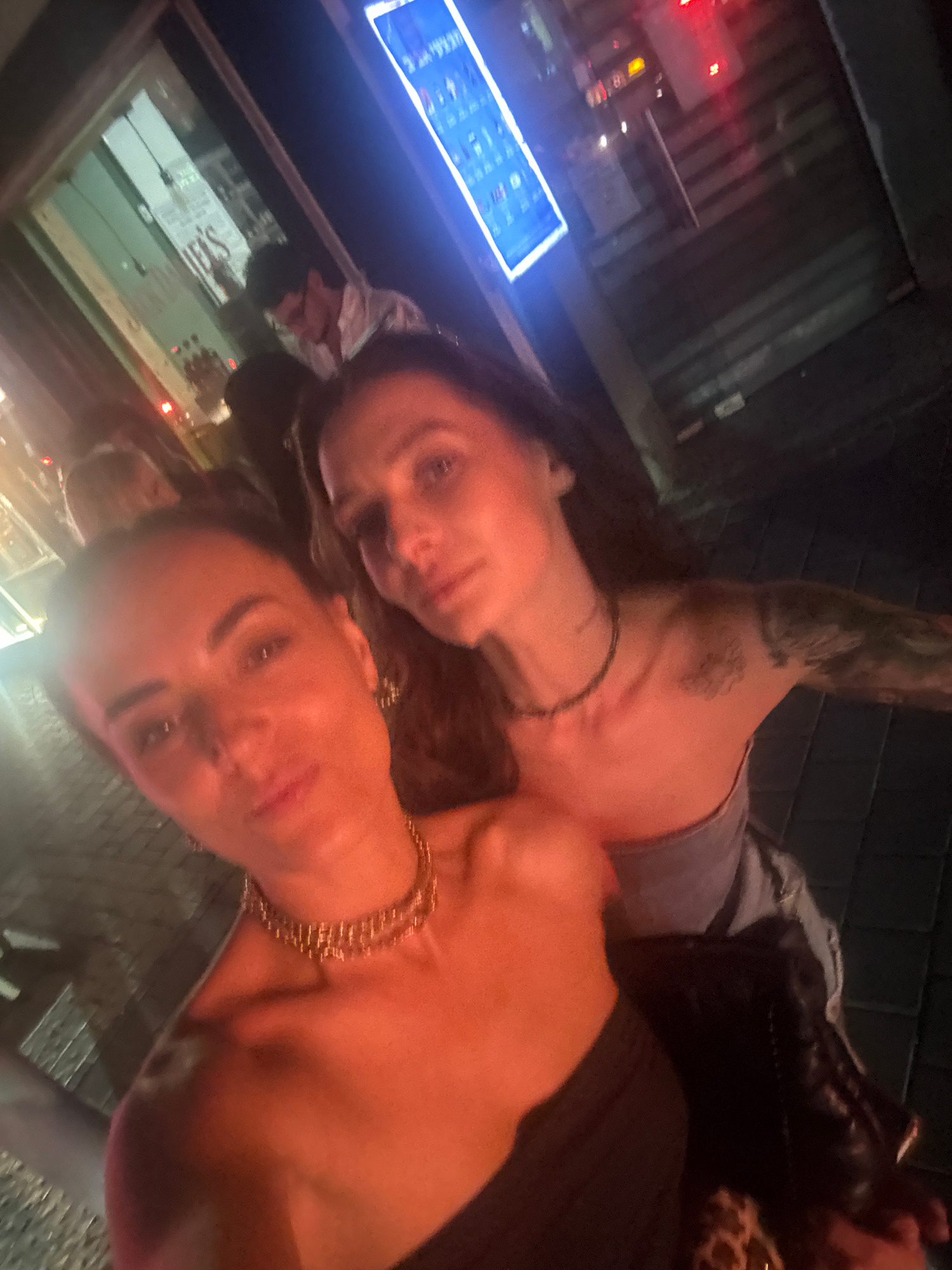 Two women are positioned in the foreground, close to the camera. The woman on the left has a visible arm tattoo and is wearing a thin necklace. The woman on the right is wearing a gold chain necklace.…read more