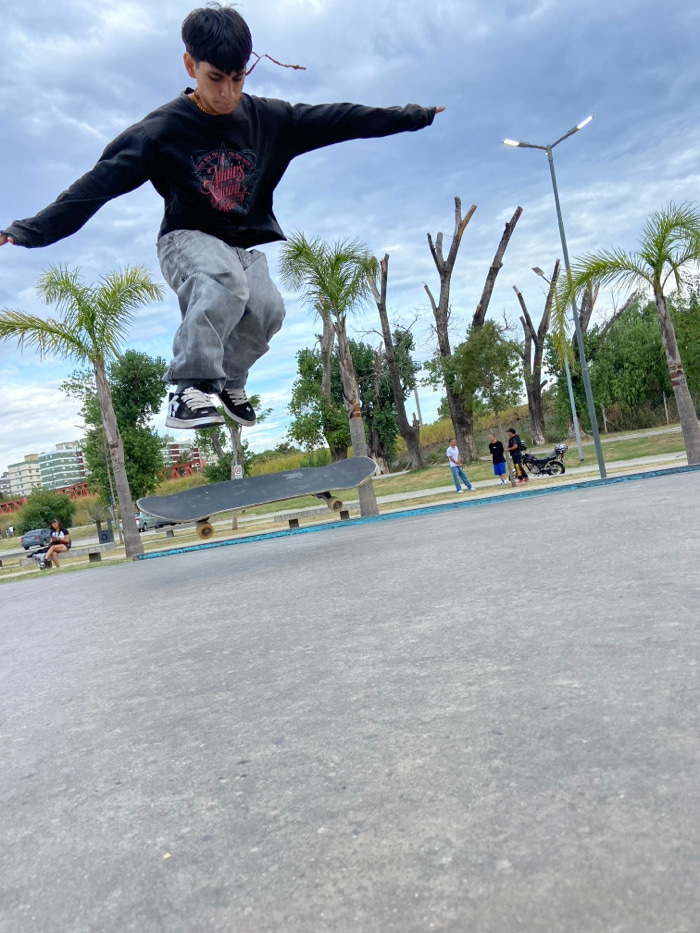 A skater in a black shirt and baggy gray pants jumps off his skateboard in mid-air. He wears black and white sneakers. The backdrop includes trees, a light pole, a cloudy sky, and a concrete surface w…read more