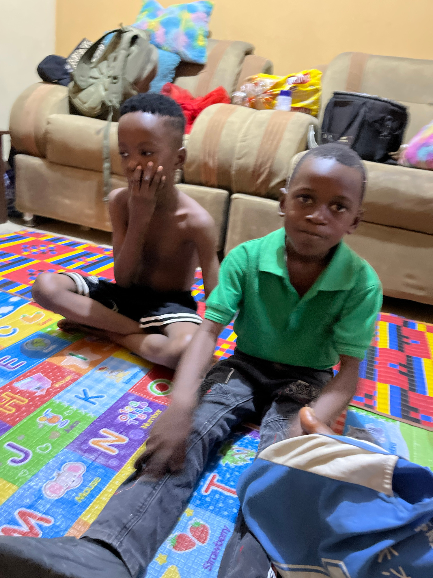 Two young Black children are indoors, sitting on a colorful ABC alphabet play mat. One child wears a green polo shirt and dark jeans, while the other is shirtless with black and white striped shorts.…read more