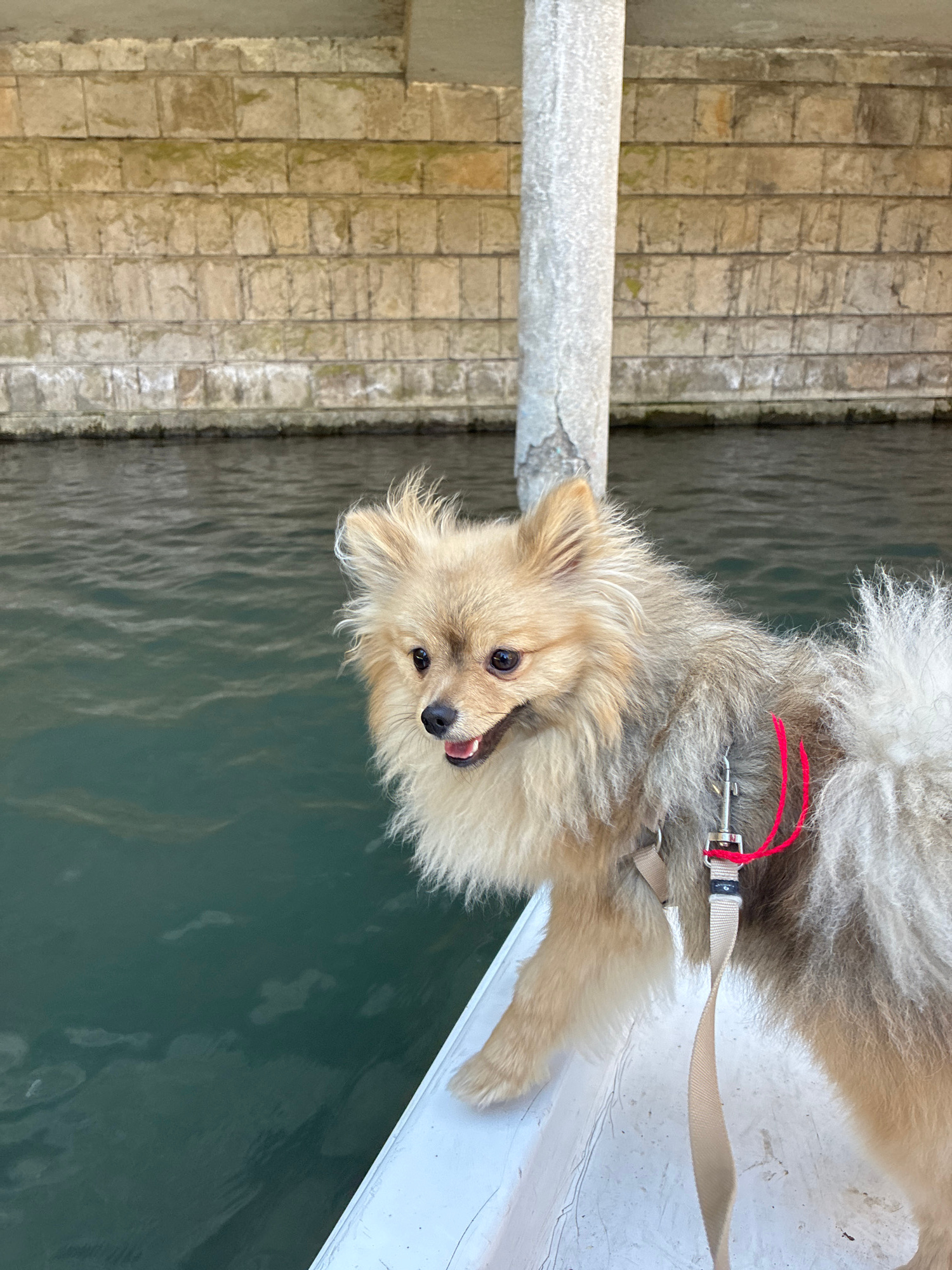 A small tan and white long-haired dog, possibly a Pomeranian, is photographed from above while on what appears to be a small boat or structure alongside a canal or waterway. The dog has a red string t…read more