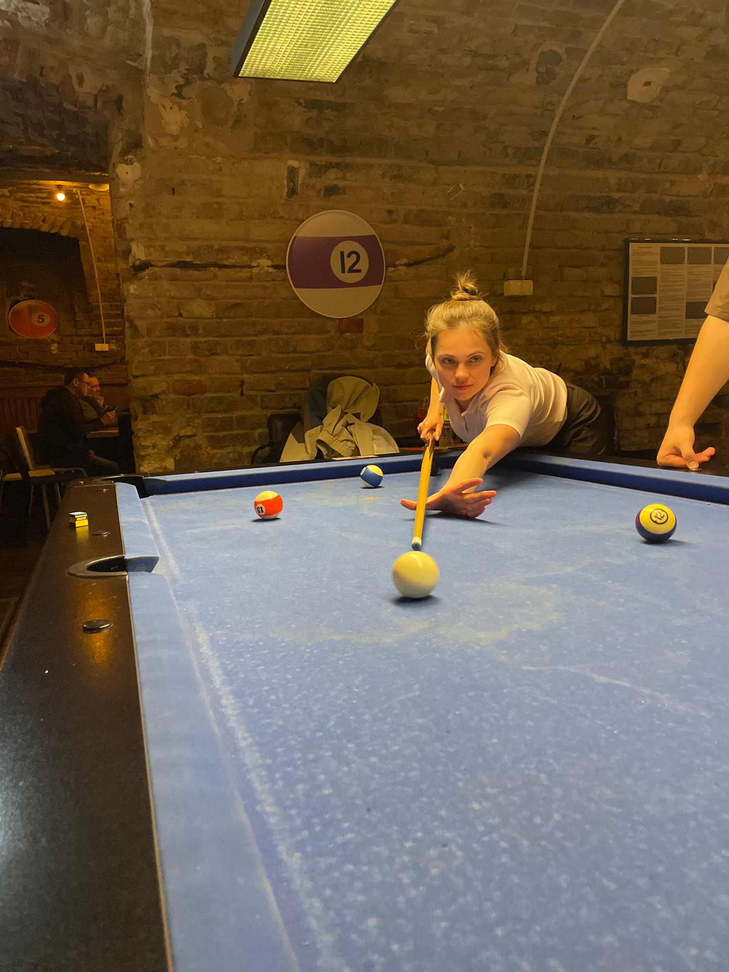 A woman with her hair in a bun is playing pool in a room with exposed brick walls. The pool table is blue and has several balls on it, including an eight ball and a cue ball. The woman is lining up a…read more