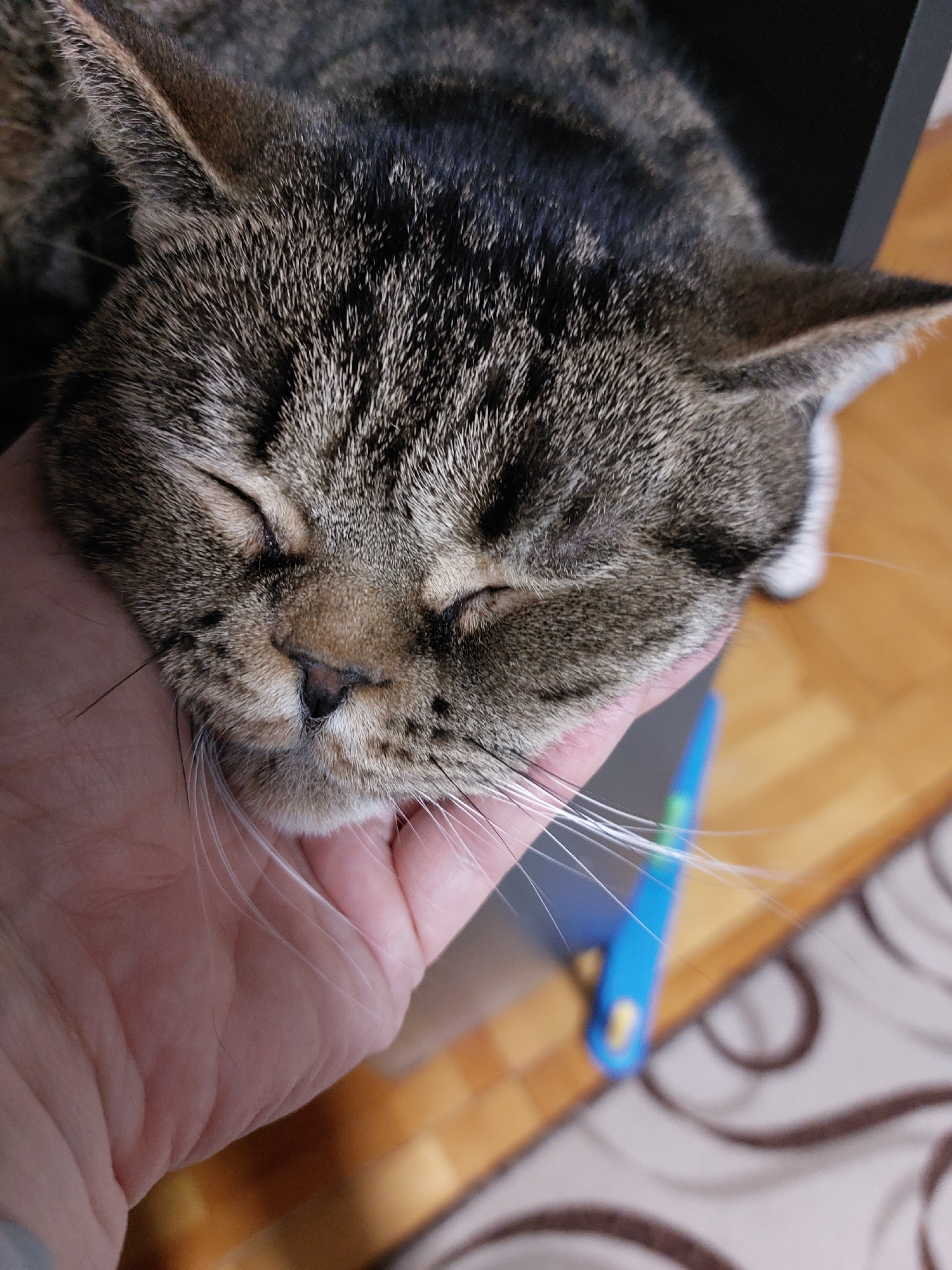 A close-up, high-angle shot shows a tabby cat resting its head comfortably on a human hand, conveying a sense of peace and affection. The cat, with its eyes closed, appears to be sleeping or deeply re…read more