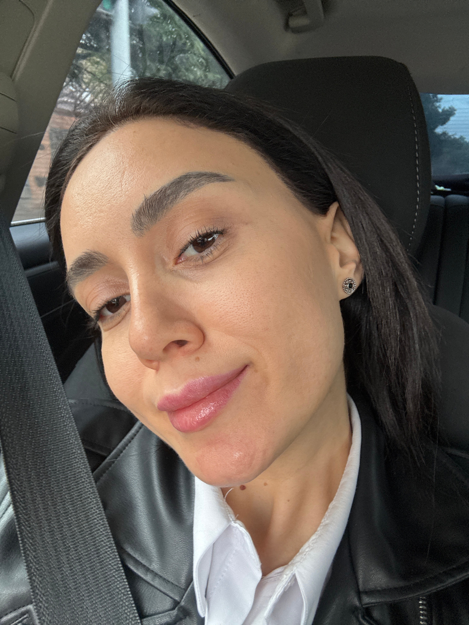 A dark-haired woman is seated in a car, wearing a black leather jacket and a white shirt. She is secured with a seatbelt. Her head rests against the headrest of the car seat. She has fair skin, dark e…read more