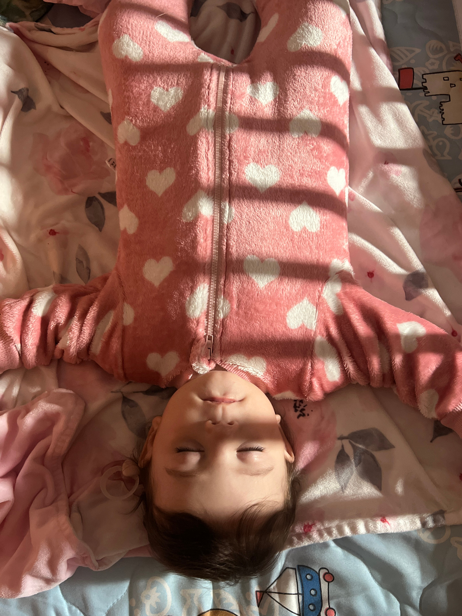 A baby sleeps supine on a bed. The baby wears a pink, long-sleeved onesie with white hearts. Shadows from a window or blinds fall across the baby's body. The bed has multiple blankets: a white blanket…read more