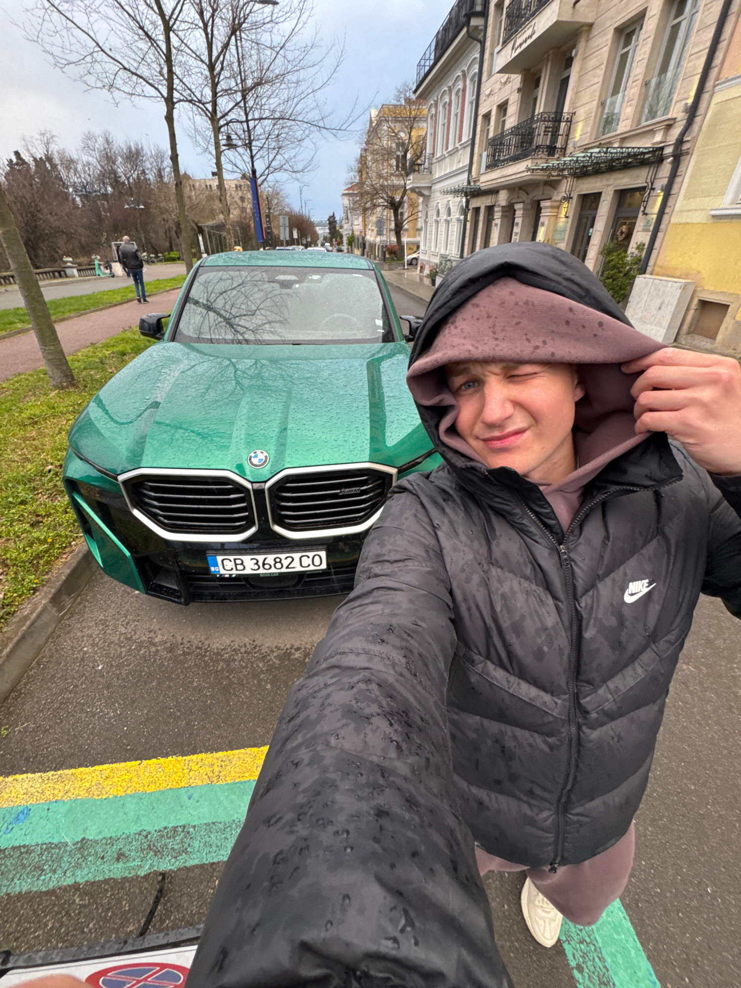 The image shows a person taking a selfie with a green BMW car in Burgas, Bulgaria. The person is wearing a black Nike puffer jacket with a hoodie pulled over their head, and a light purple sweatshirt…read more
