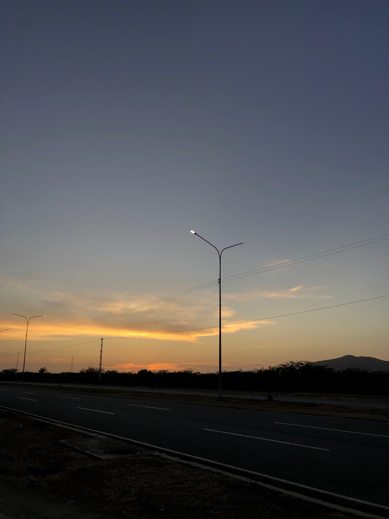 The image shows an evening landscape with a road running along the right side. To the right of the road is a dark, grassy area, and beyond that, a line of trees. In the distance, there is a hill or mo…read more