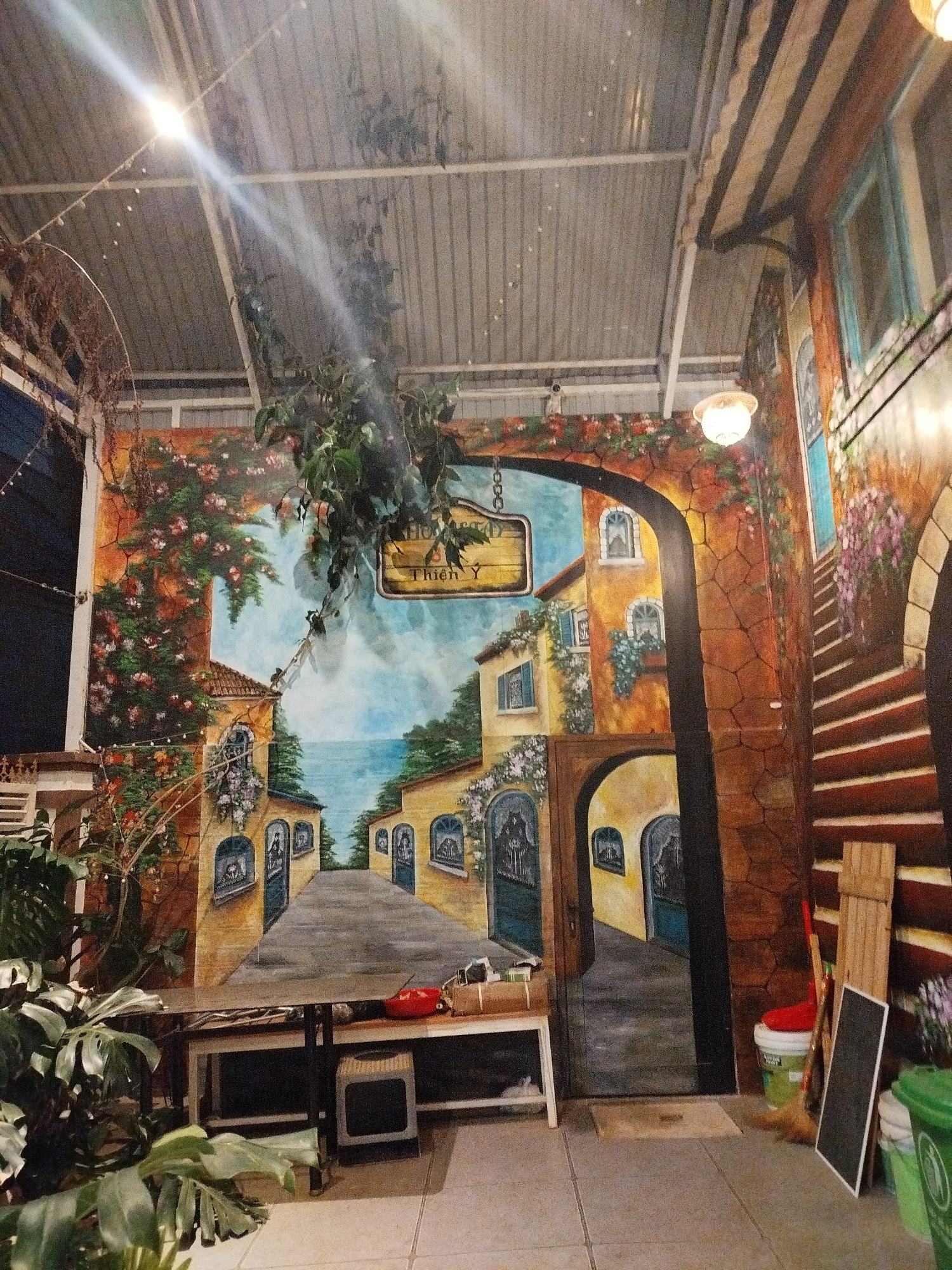 The photograph shows an indoor space in Da Lat, Vietnam, which appears to be a cafe or restaurant with a painted mural on the back wall. The mural depicts a Mediterranean-style street scene with build…read more