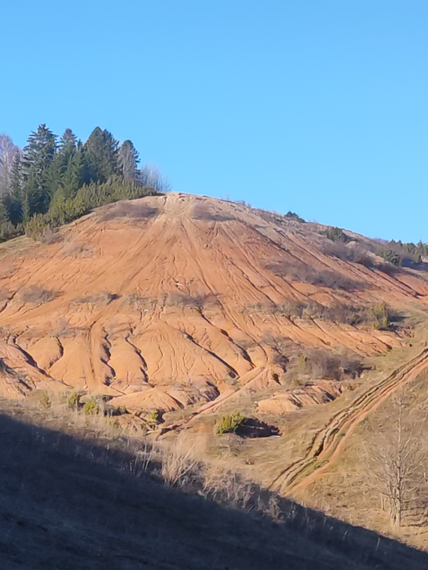 The image depicts a reddish-brown hill under a clear blue sky in Прикамский, Russia. A cluster of coniferous trees is located near the summit. Erosion has created numerous channels on the hill's surfa…read more