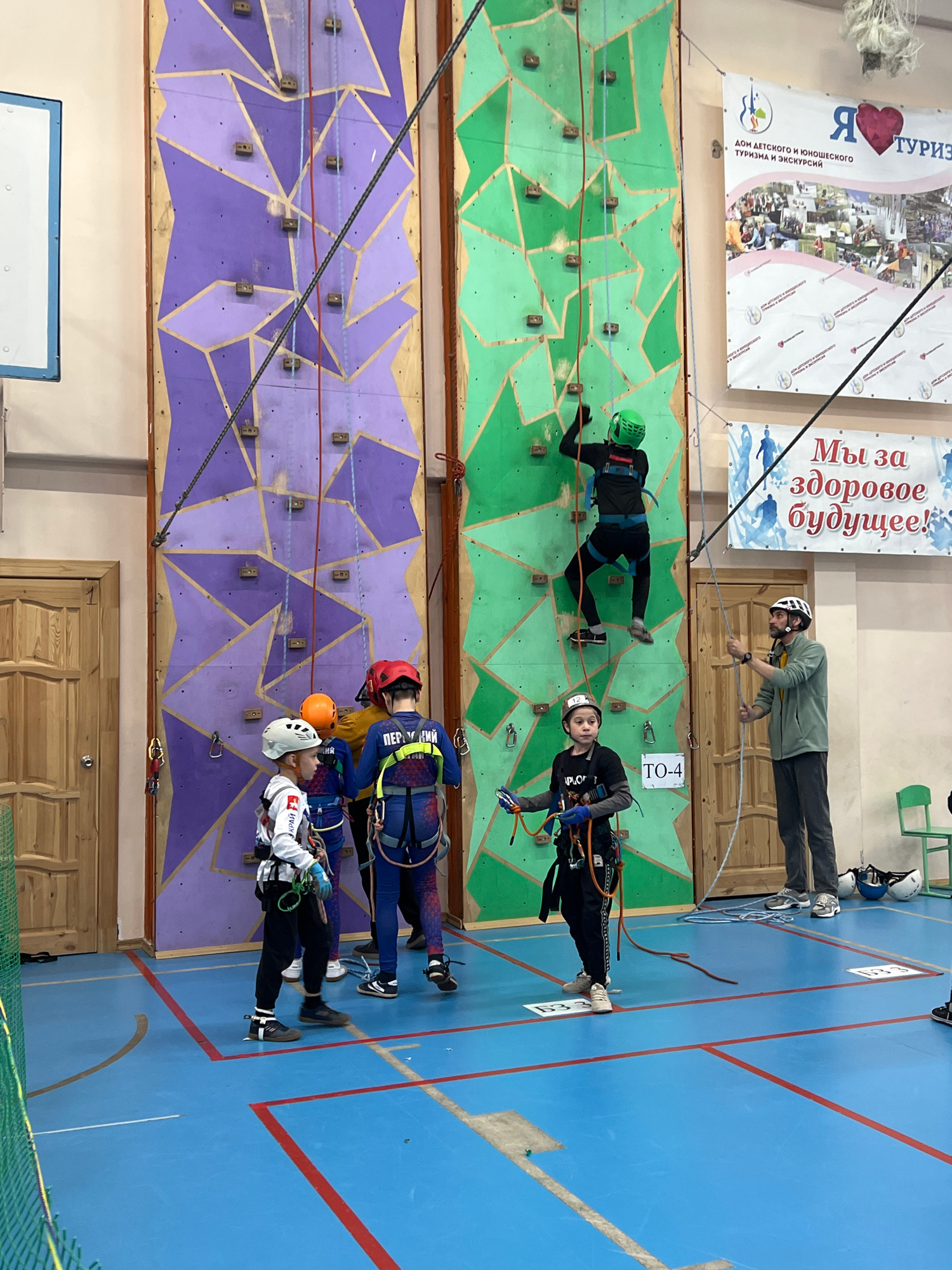 The image shows an indoor climbing wall in Berezniki, Russia, with two separate climbing routes of different colors (green and purple). There are multiple people engaged in climbing, wearing helmets a…read more