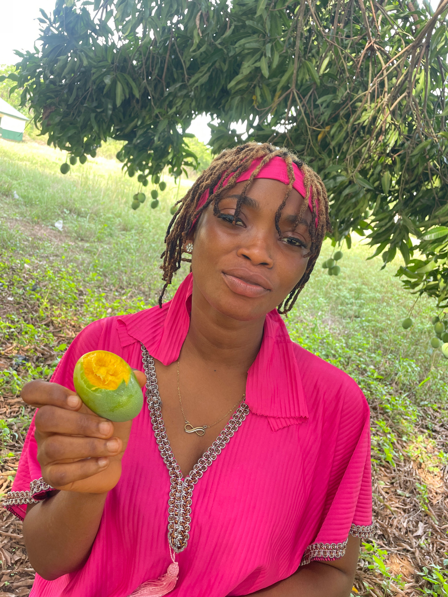 A medium shot shows a woman outdoors, holding a partially eaten green mango. She has dark skin and wears dreadlocks, styled with a pink headscarf or bandeau. Her expression is calm and direct, with a…read more