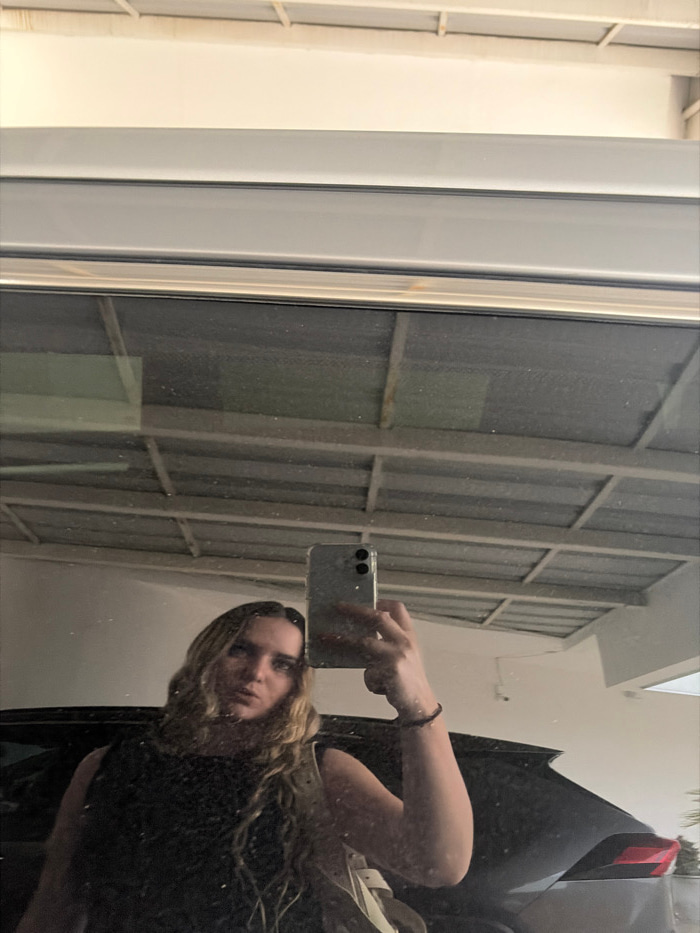 The image depicts a female subject captured in a selfie-style reflection within a large, rectangular reflective surface, located in San Bernardino Tlaxcalancingo, Mexico. The subject, a woman with lon…read more