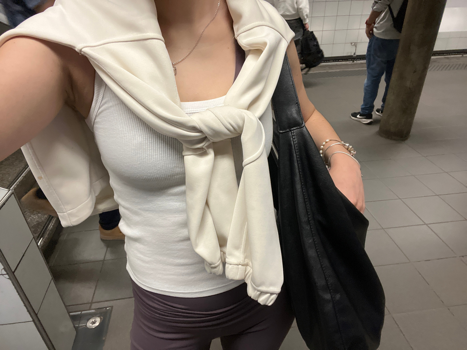 The image shows a person wearing a white tank top, brown leggings, and a white top tied in front. A black leather jacket hangs off one shoulder. The person is also wearing bracelets and a necklace. Th…read more