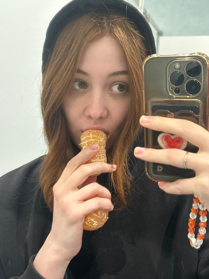 A person in a black hoodie is taking a selfie while eating a peeled orange. The person's left hand holds the phone, which has a clear case with a heart-shaped design and a beaded strap. The right hand…read more