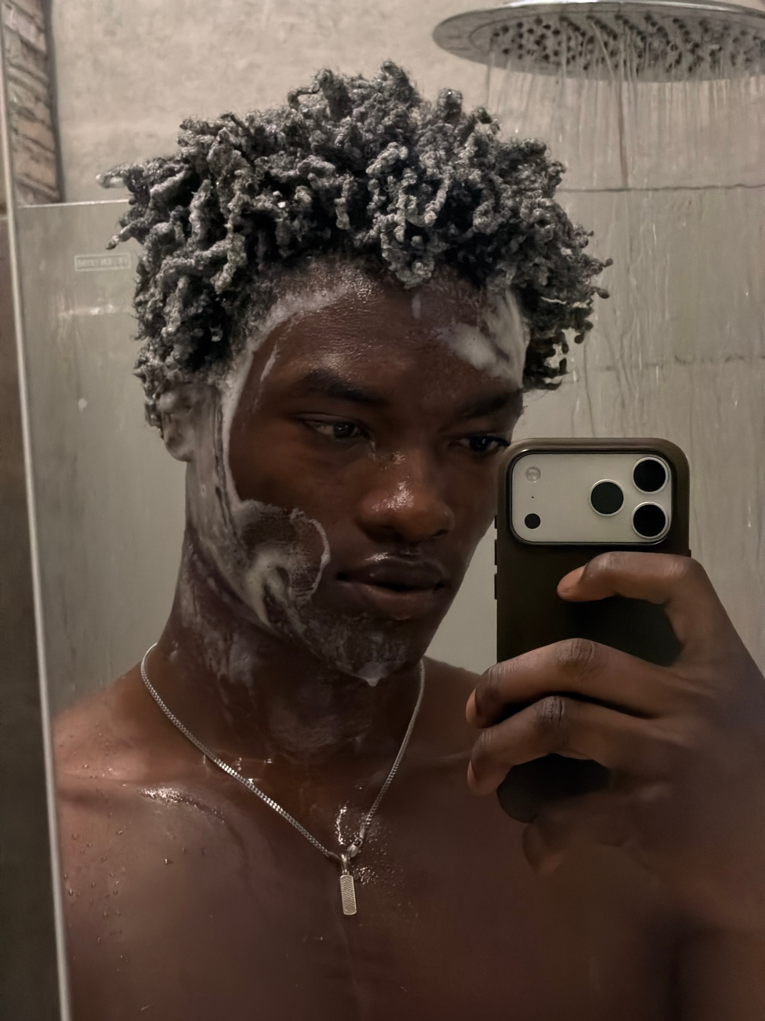 A young adult male is captured in a selfie taken through a reflective surface, likely a mirror or glass shower door, while actively showering. His dark, textured hair and parts of his face are covered…read more