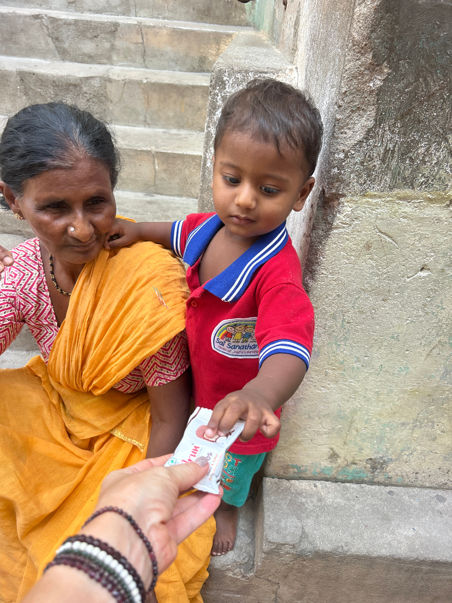 A daytime, high-angle photograph shows a woman and child on concrete steps. The child, with dark hair and skin, wears a red collared shirt with blue and white trim. He is reaching for a white rectangu…read more