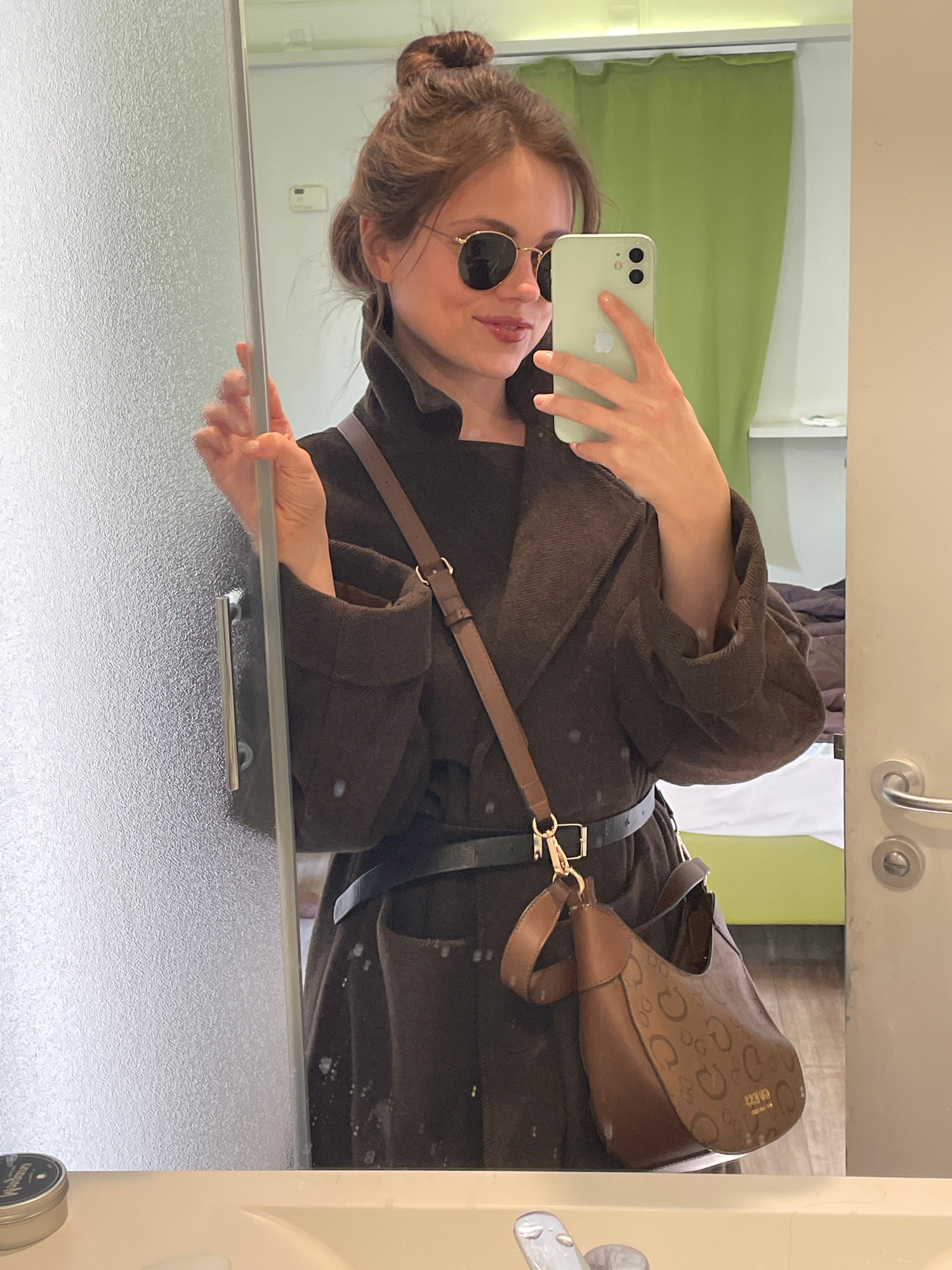 A young woman wearing sunglasses and a brown robe with a handbag stands in front of a mirror, taking a selfie with her smartphone. She is located in what appears to be a bathroom, evidenced by the sho…read more