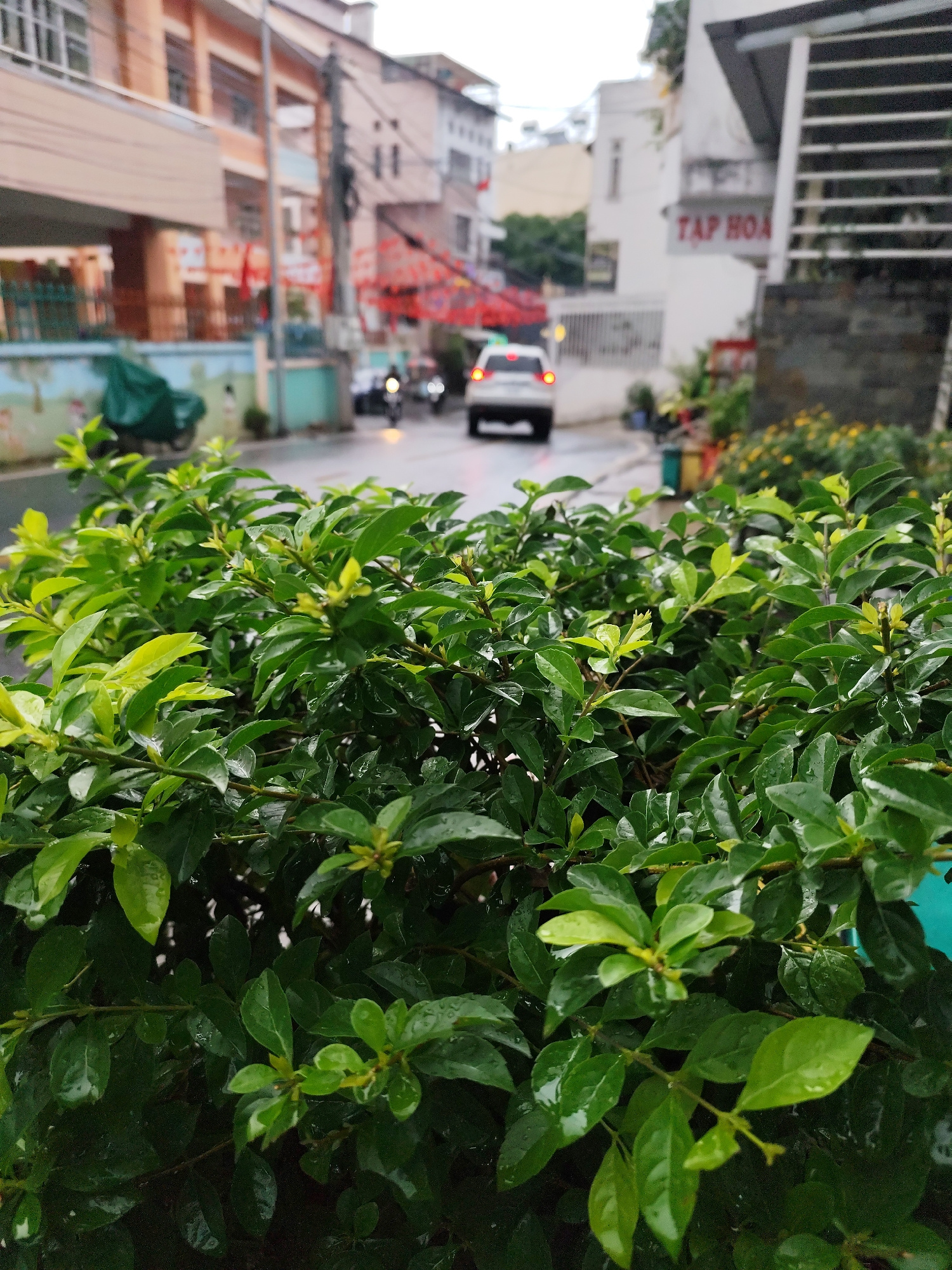The image presents a street scene in Da Lat, Vietnam, characterized by a lush green plant acting as a prominent foreground element. The leaves of the plant are visibly wet with water droplets, suggest…read more