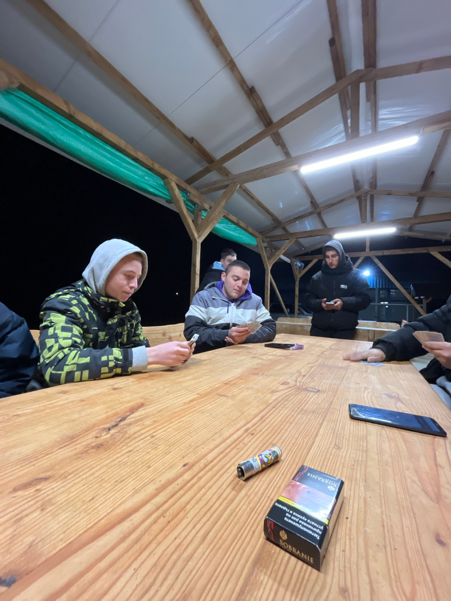 The image depicts four individuals seated around a wooden table in an open structure with a roof, possibly a gazebo or a covered patio. The structure appears to be illuminated by fluorescent lights attached to the ceiling. Outside the structure, the environment is dark, suggesting it is nighttime. On the table, a black smartphone lies near a pack of Sobranie cigarettes and a lighter. The individuals appear to be engaged in a casual activity, possibly playing cards. The location is assumed to be somewhere in or around Karavelovo, Bulgaria, but no specific landmarks or indicators in the image confirm this location. The individuals are wearing casual clothing, including hooded jackets. | Open Wire
