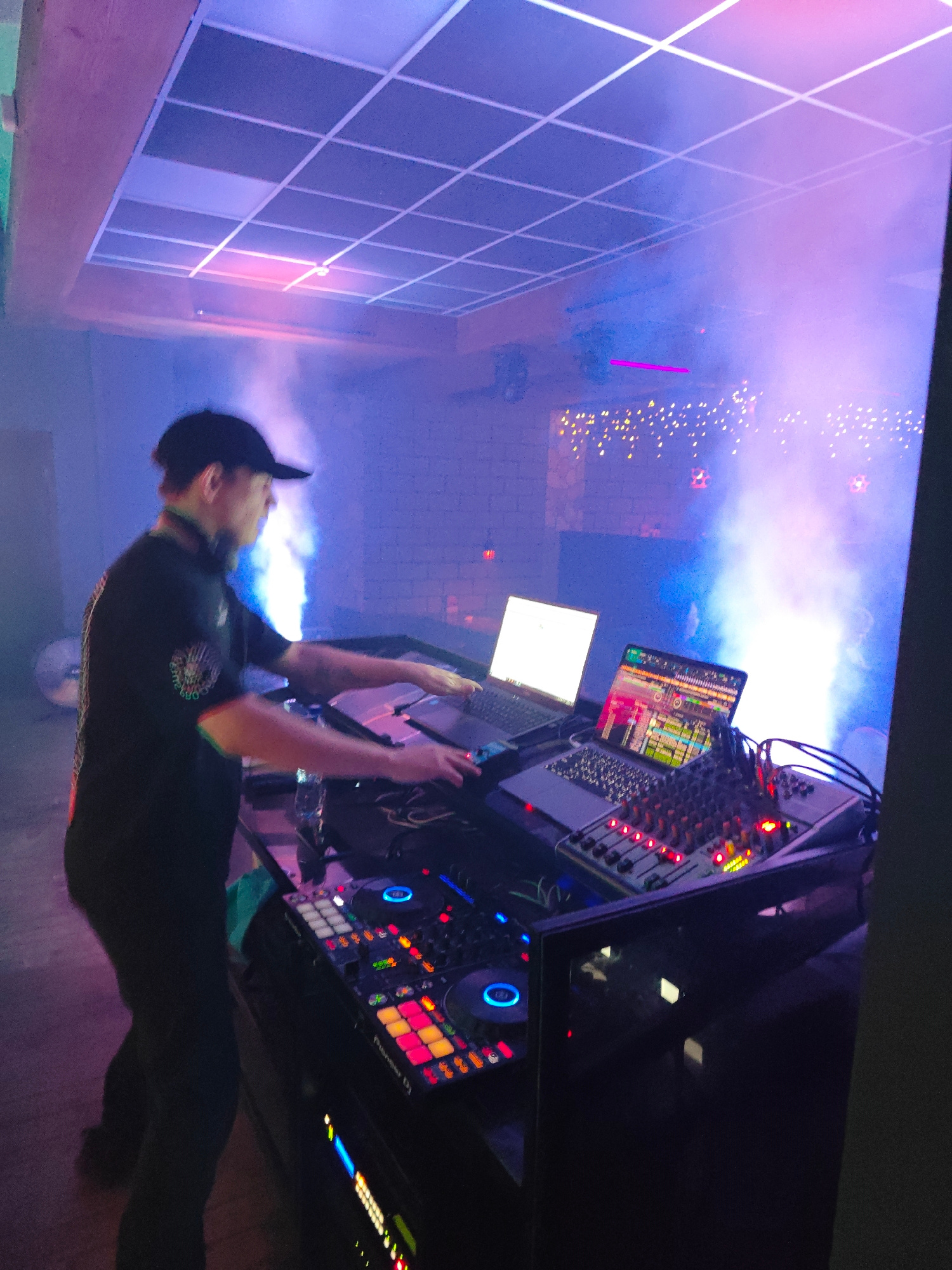 The image depicts a DJ in a nightclub setting, presumably in Chaikovsky, Russia, although this is not definitively confirmed. The DJ, wearing a black t-shirt and baseball cap, is operating electronic…read more
