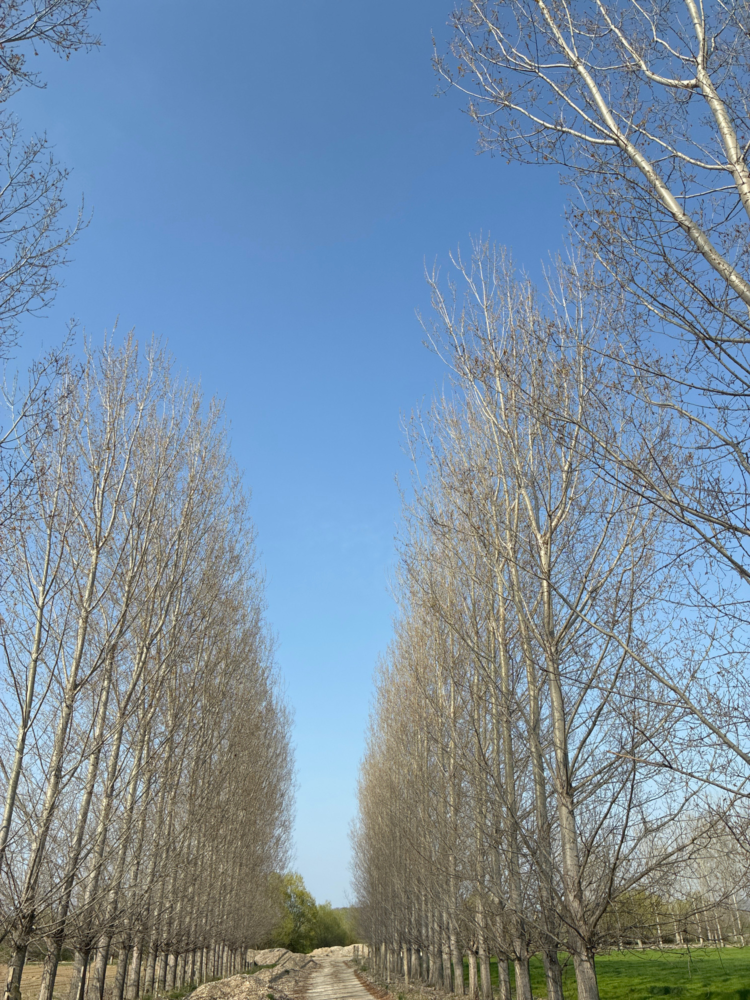 The image depicts a view along a road lined with tall, bare trees, likely poplars or aspens, in what appears to be an agricultural or rural area near Zlokuchene, Bulgaria. The perspective is low, look…read more