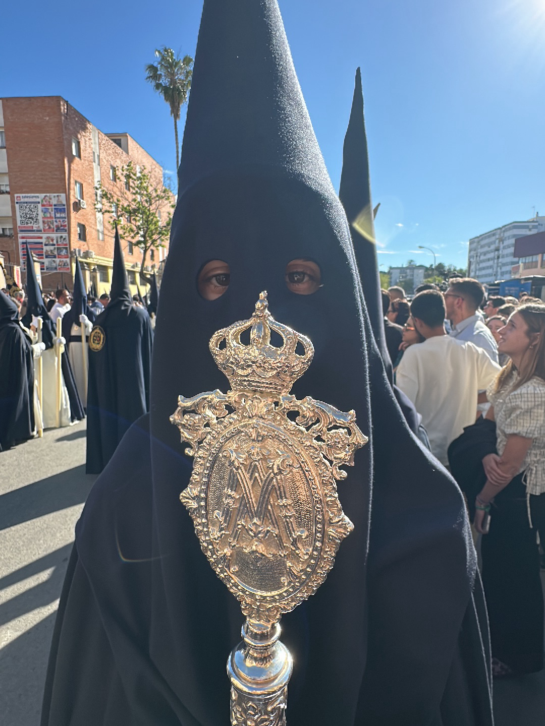 A close-up photograph depicts a member of a religious brotherhood participating in a Holy Week procession in Jerez de la Frontera, Spain. The individual is cloaked in a black nazareno robe and hood, w…read more