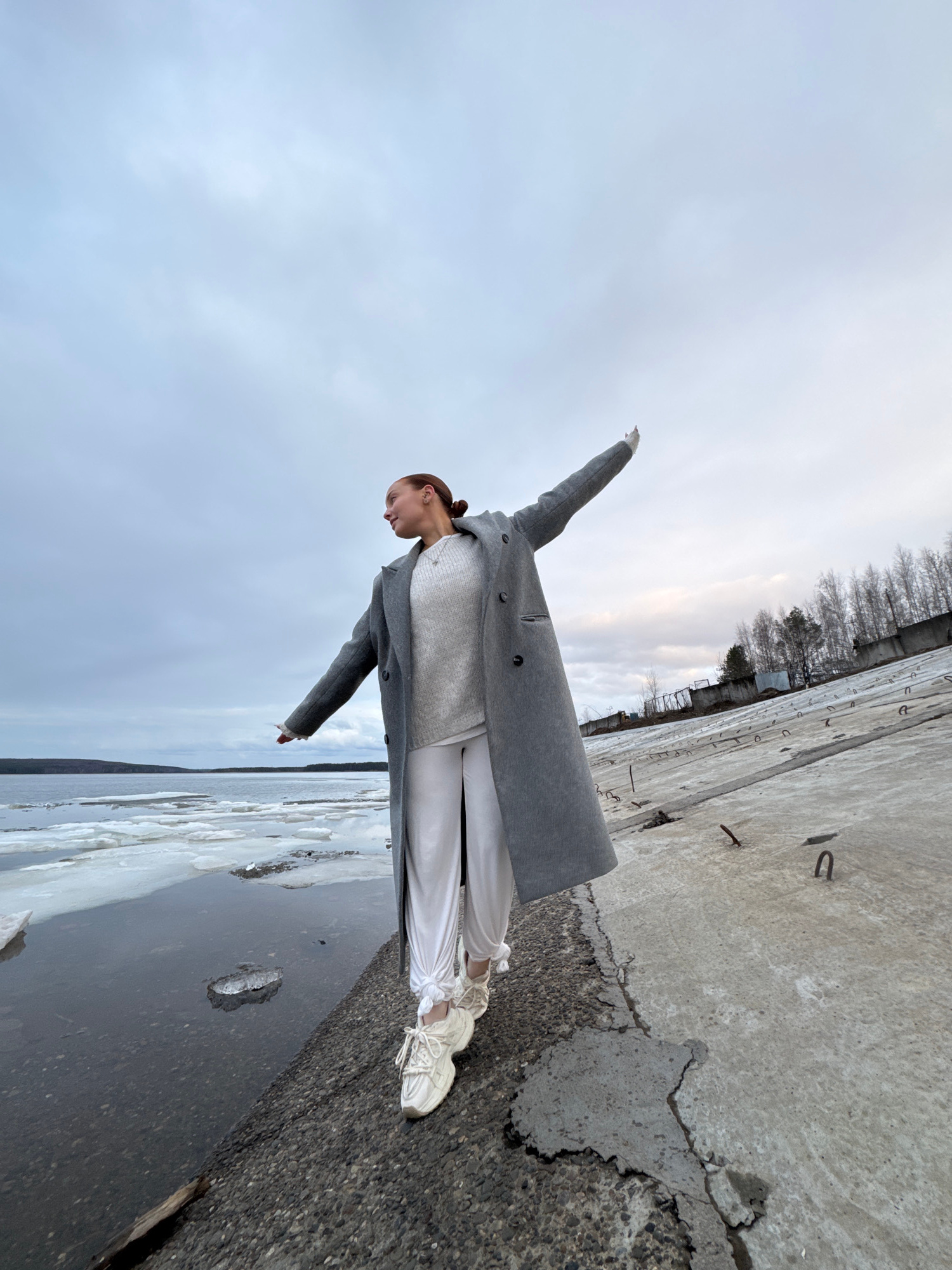 A full-body, horizontally oriented shot depicts a young woman standing on a weathered concrete embankment next to a body of water. The woman, shown in profile, is positioned on the right side of the f…read more