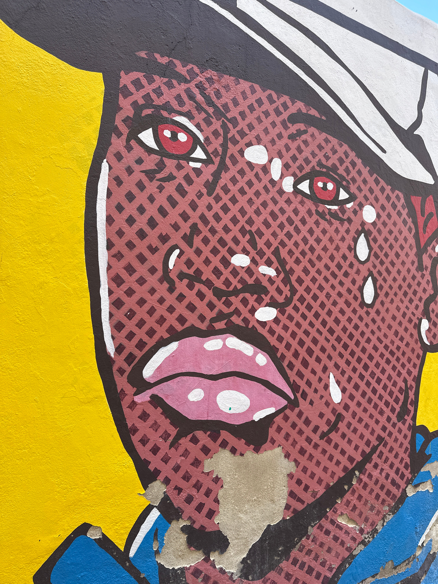 The image is a close-up section of a Pop Art-style mural, possibly depicting a female face in distress, given the eyes with red pupils and white highlights suggestive of tears. The face is rendered in…read more