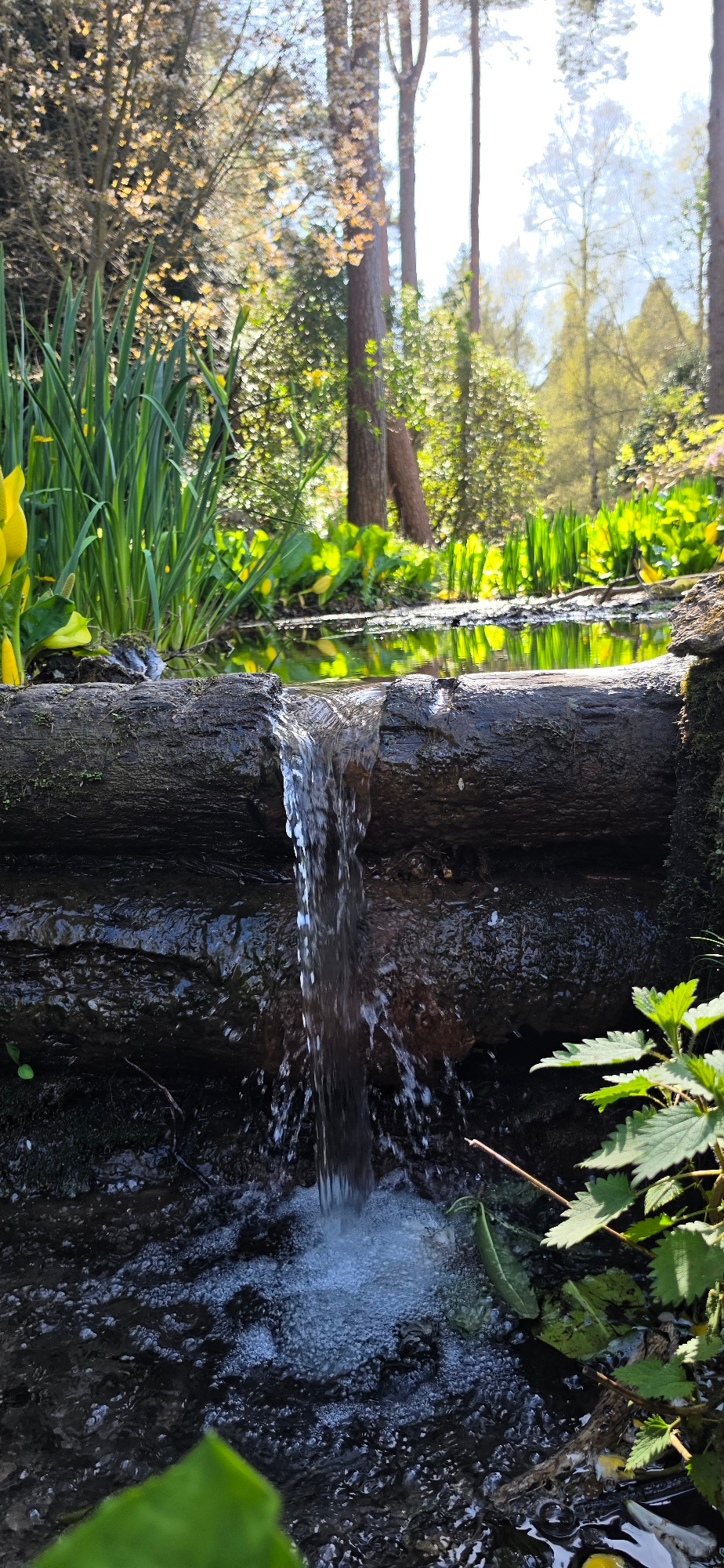 A body of water flows over a tree trunk, creating a small waterfall. The water is clear and turbulent, and the surrounding area is lush with vegetation. The image was taken in Crawley, United Kingdom.