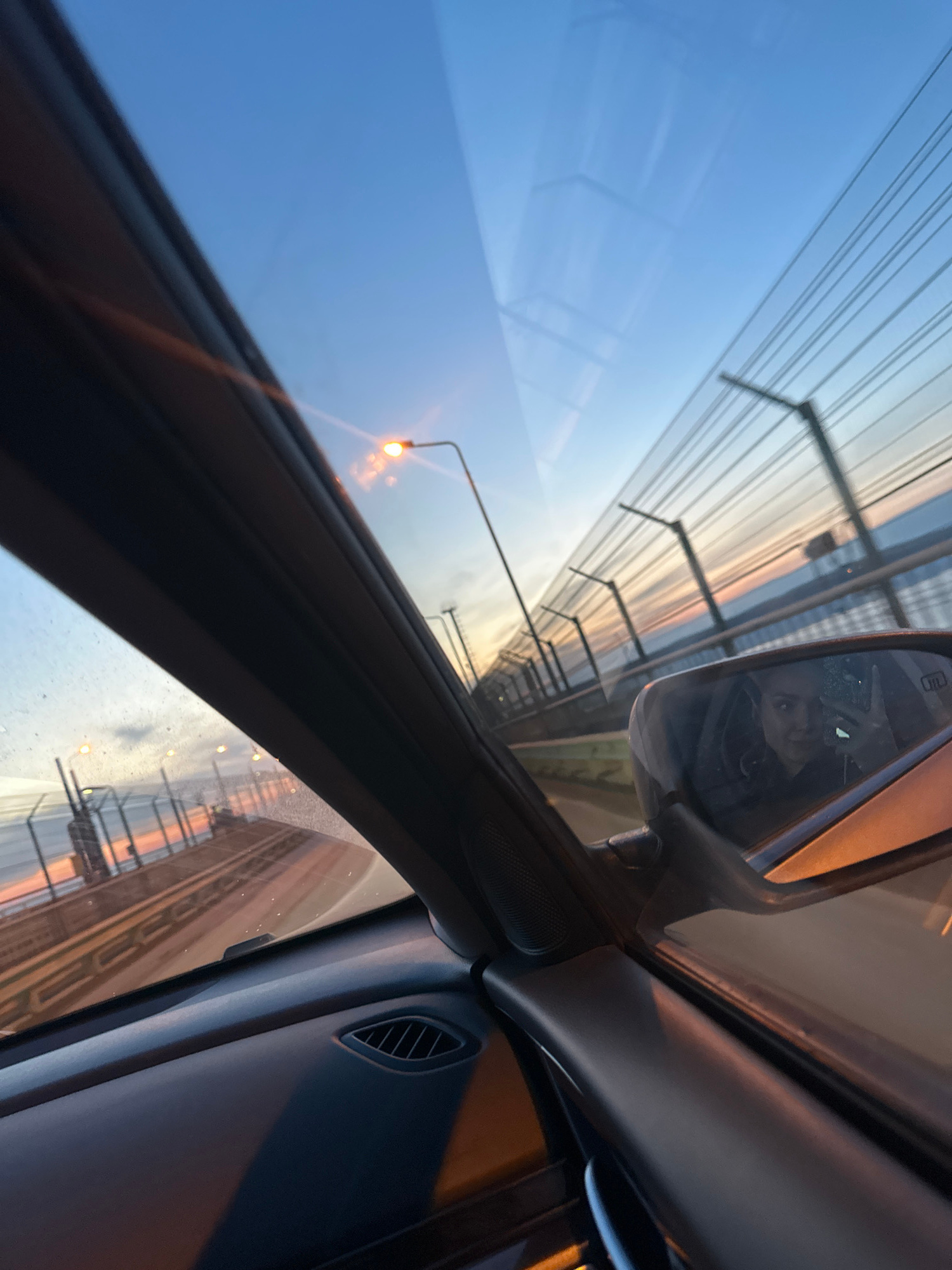 The image shows a view from inside a car, likely on a bridge in Chaikovsky, Russia. The scene is captured through the front windshield, partially obscured by the car's interior trim and a side mirror…read more