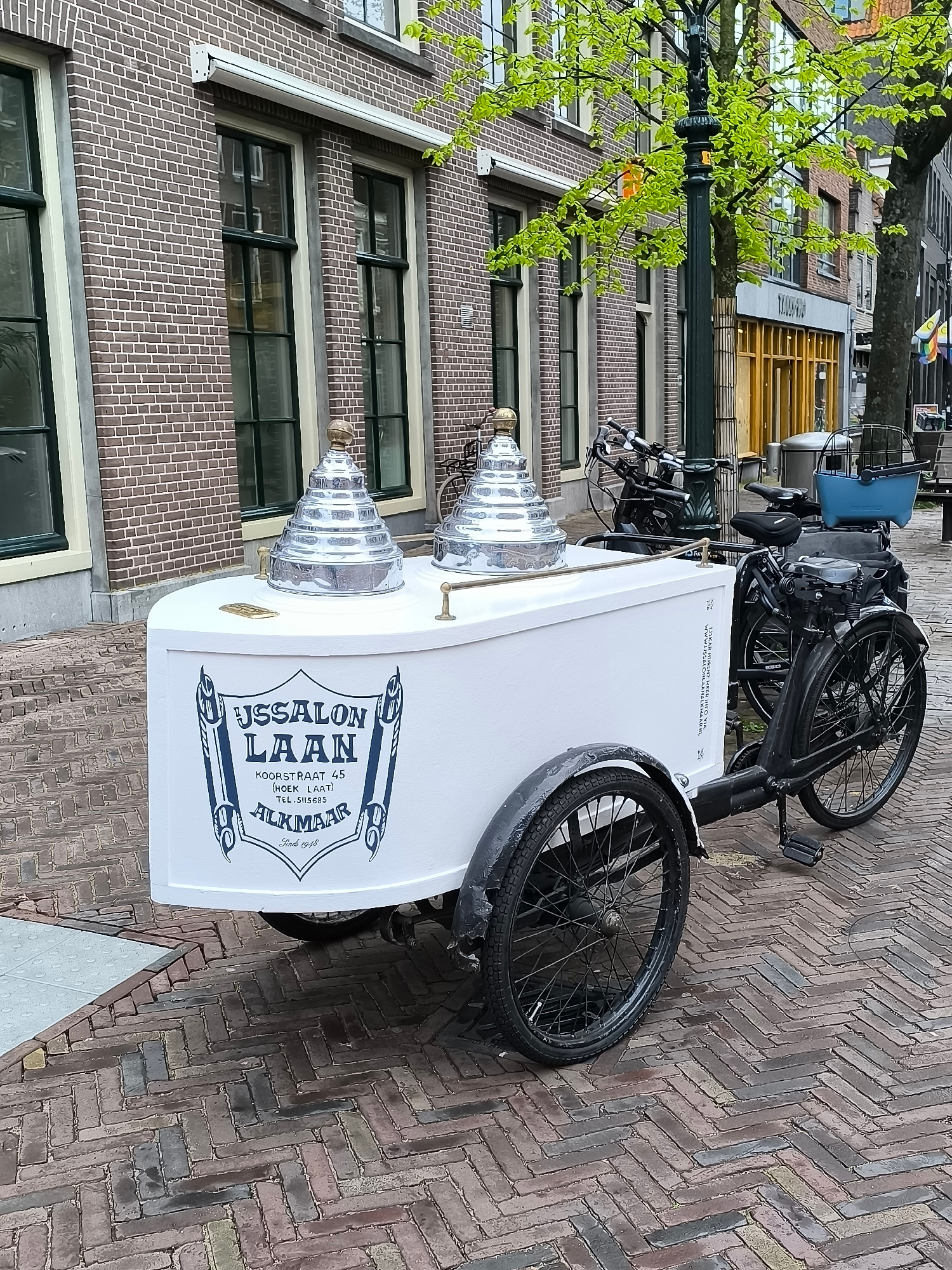 A classic white ice cream bicycle cart is the central focus of this street scene in Alkmaar, Netherlands. The cart features a prominent white box body with dark fenders and a black bicycle frame and w…read more