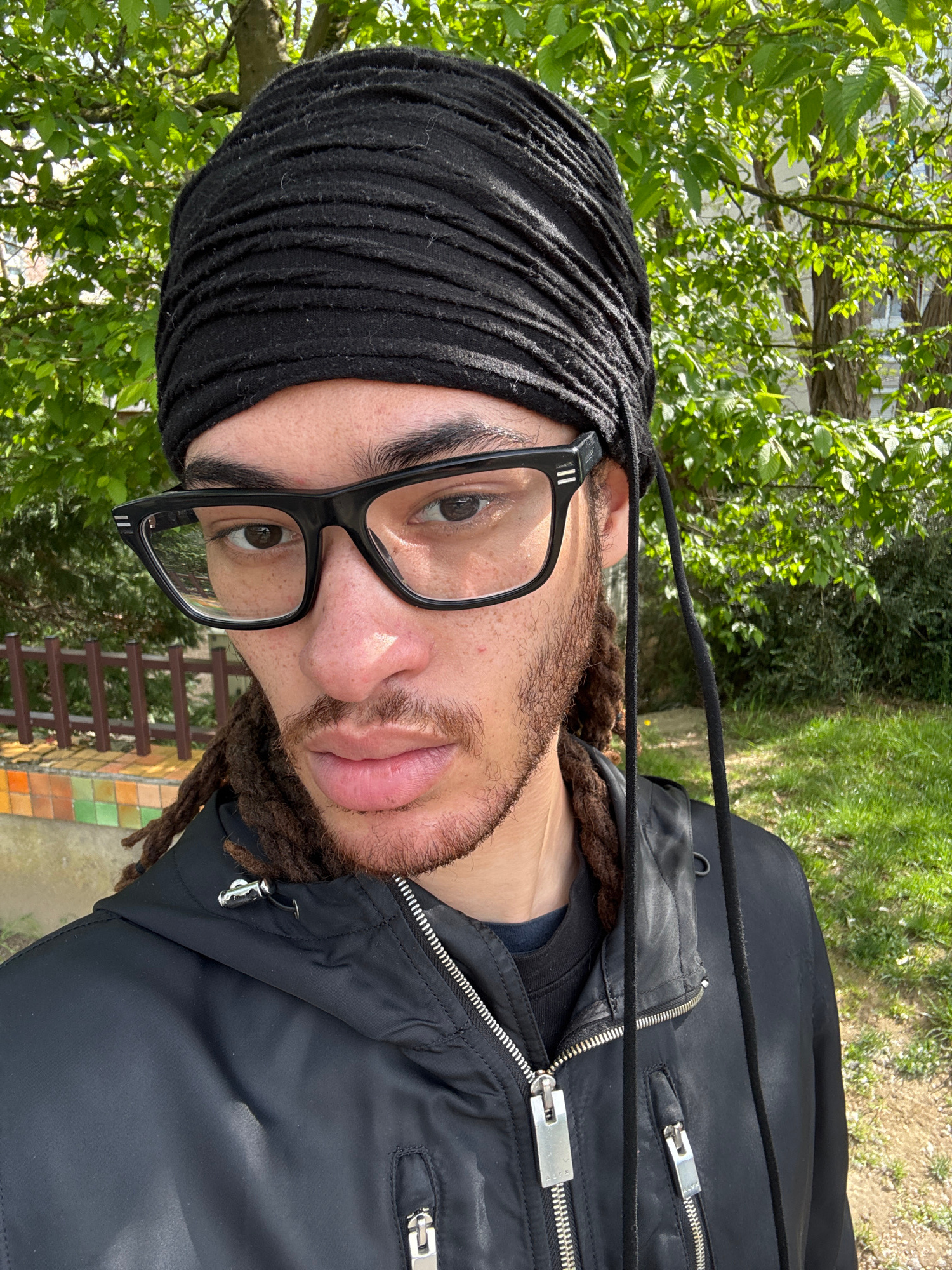 A man with brown dreadlocks and glasses is wearing a black head covering and jacket. The photo appears to be taken outdoors near a tree and a tiled sidewalk. The location may be Les Ulis, France.