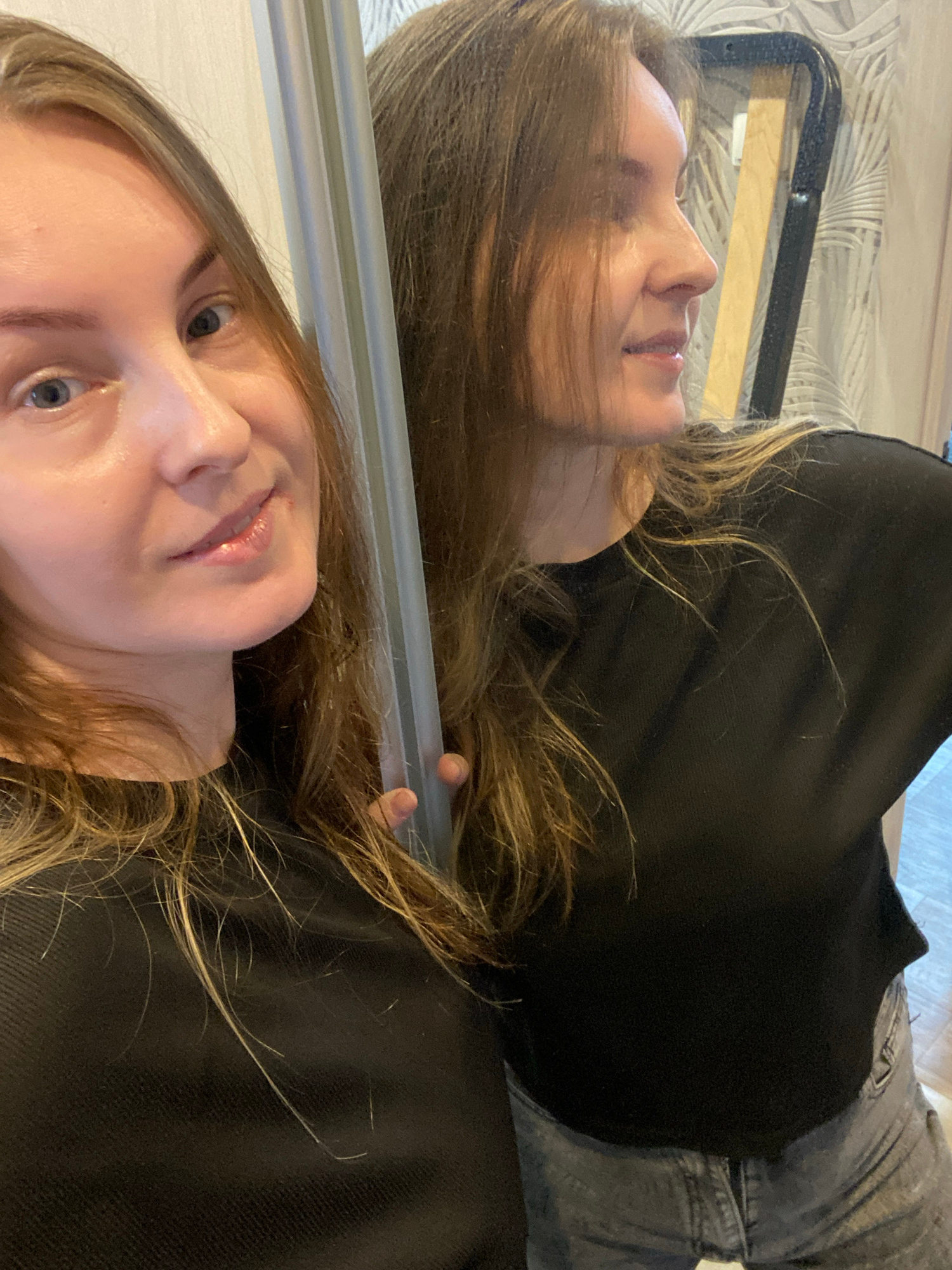 A selfie-style image shows a young woman reflected in a mirror or similar reflective surface. She is wearing a black top and what appears to be gray jeans. Her hair is long and light brown with blonde…read more
