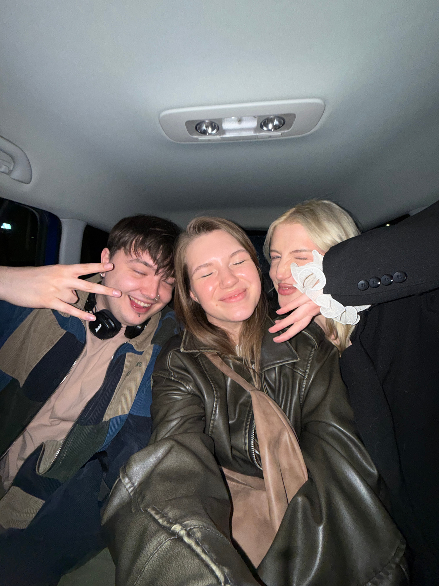 The image depicts three individuals in the interior of a vehicle, potentially a car, as suggested by the overhead lighting panel. The interior is predominantly grey. A young man with dark hair is positioned towards the bottom of the frame and is gesturing with his hand, creating a "peace" or "victory" sign. He is wearing headphones around his neck and appears to be smiling. Above him is a woman with brown hair, also smiling with her eyes closed. A blonde woman is situated at the top, with a ruffled white collar visible. Part of a black jacket with buttons is also present. The location, Belgrade, Serbia, cannot be definitively determined from the visual information present in the image. | Open Wire