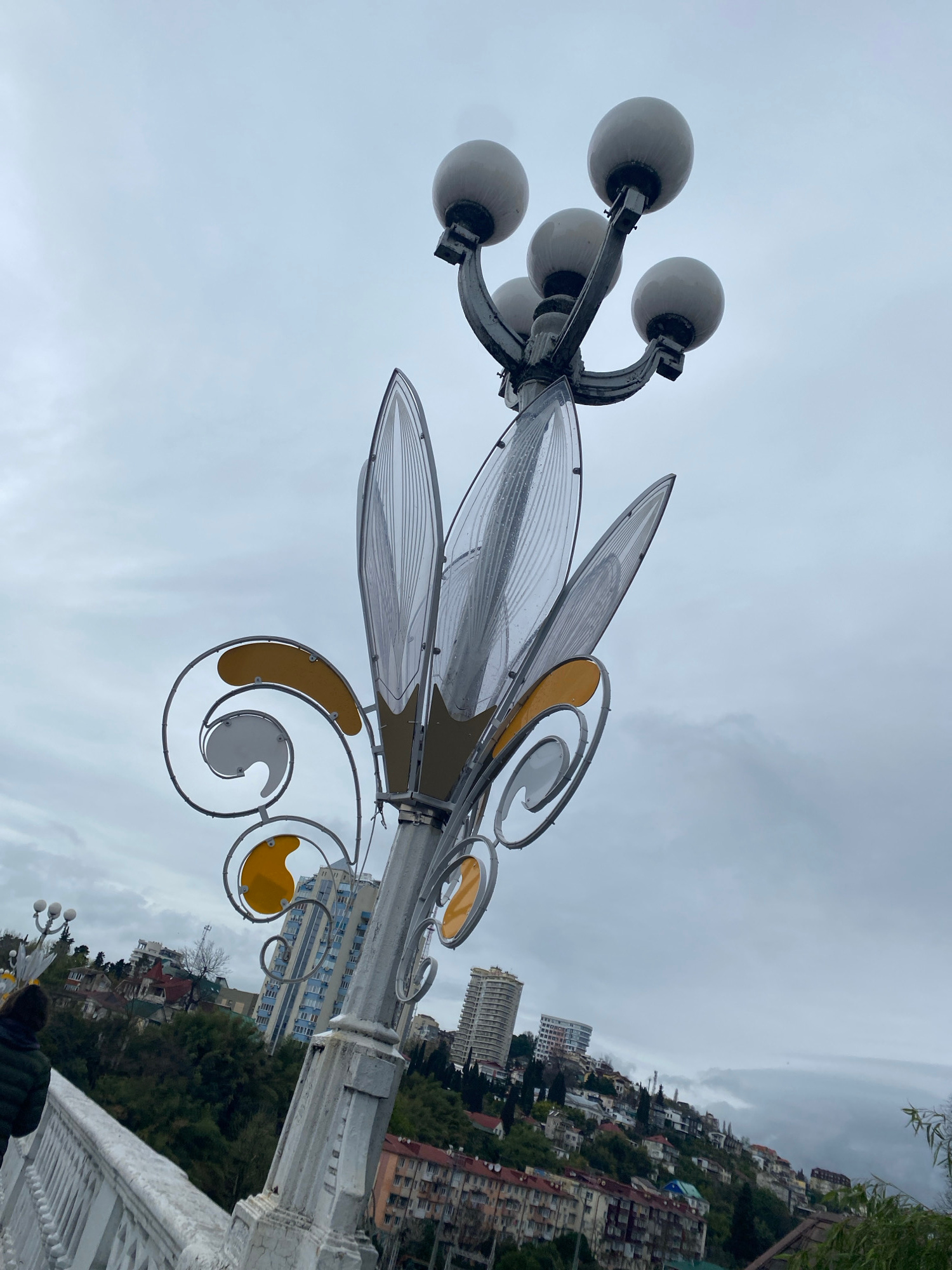 The image depicts a decorative street lamp in Sochi, Russia. The lamp consists of a cluster of six globe-shaped lights attached to a pole adorned with stylized metalwork resembling leaves and swirls w…read more