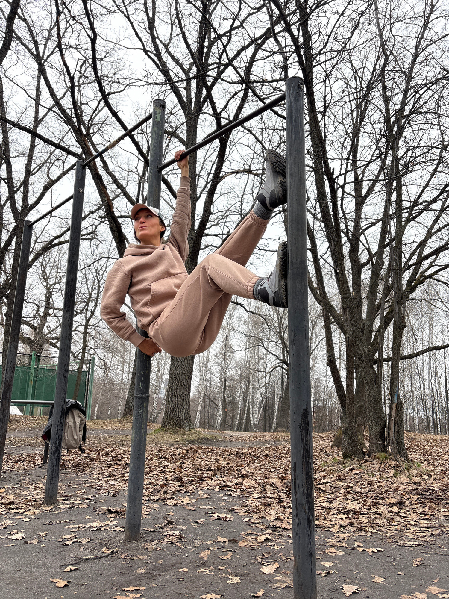 A person is performing a calisthenics exercise on parallel bars in a park in Ulyanovsk, Russia. The person, wearing a beige tracksuit, grey trainers and a cap, has their legs wrapped around one bar an…read more
