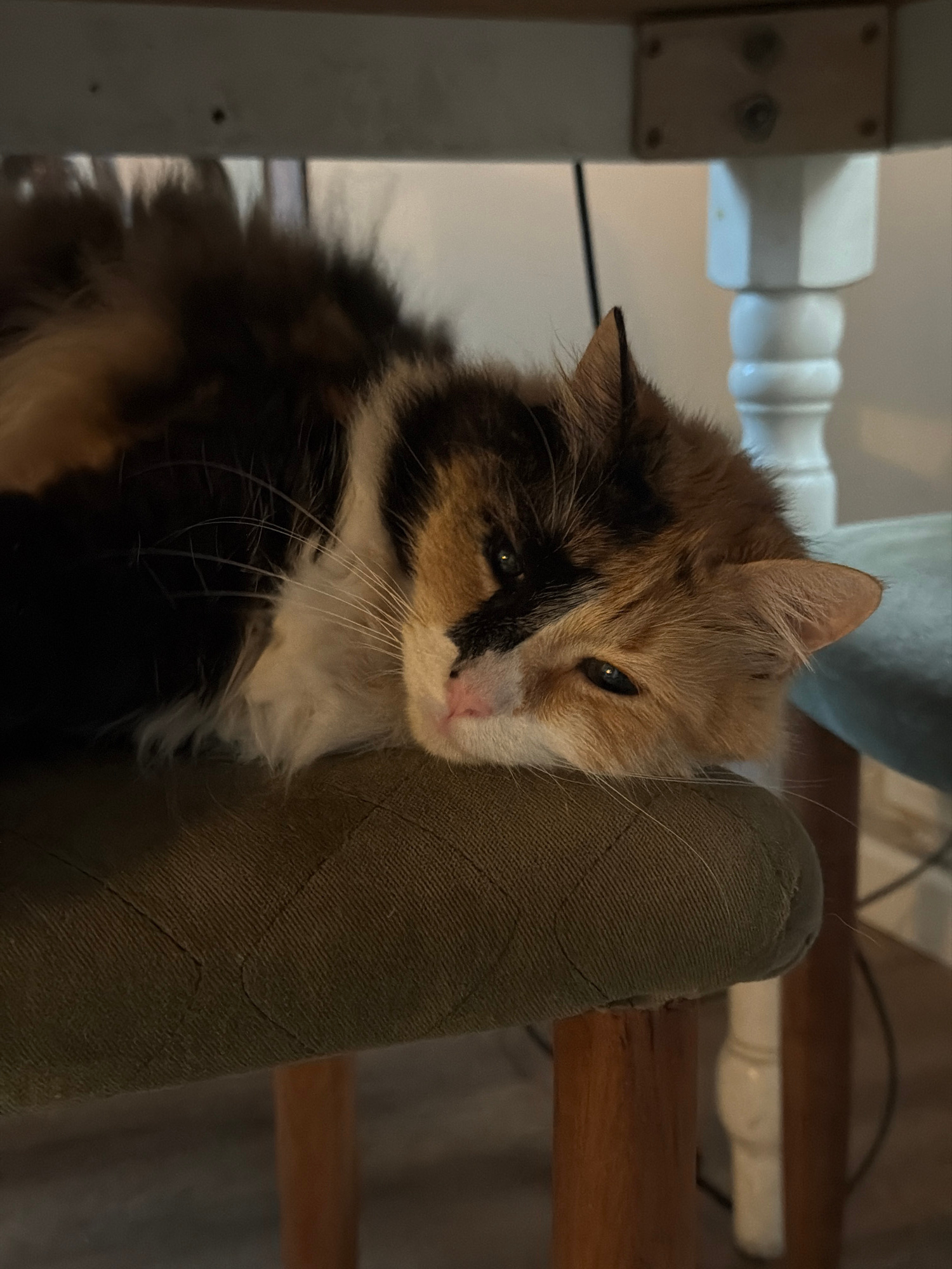 A calico cat rests its head on the arm of a chair. The cat is predominantly black and orange, with white markings on its face and chest. The chair is upholstered in a worn, green fabric. The location…read more