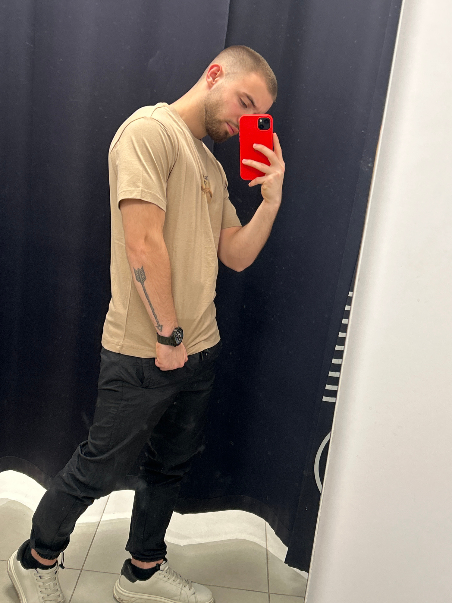 A fair-skinned male with a closely cropped haircut and a beard is taking a selfie in what appears to be a fitting room. He is holding a red smartphone in his left hand, partially obscuring his face. H…read more